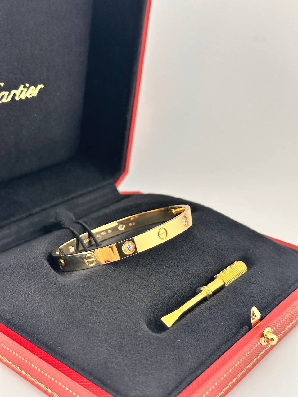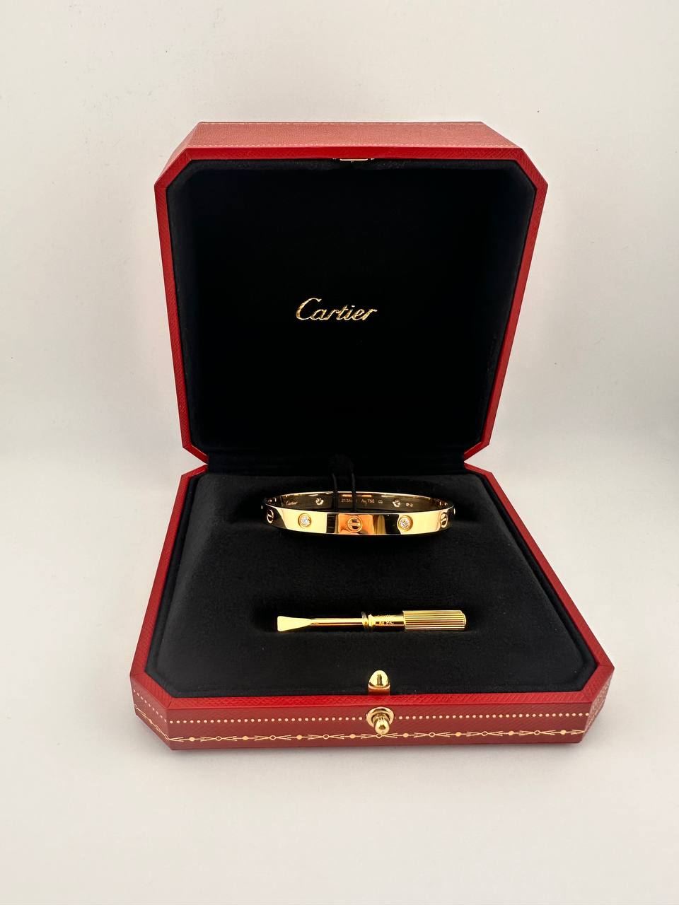 Легендарный браслет Cartier Love из золота 750 пробы, инкрустированный 4 бриллиантами. Культовый символ вечной любви и преданности.