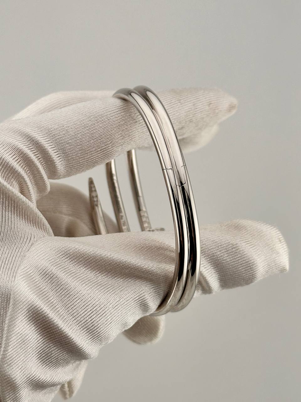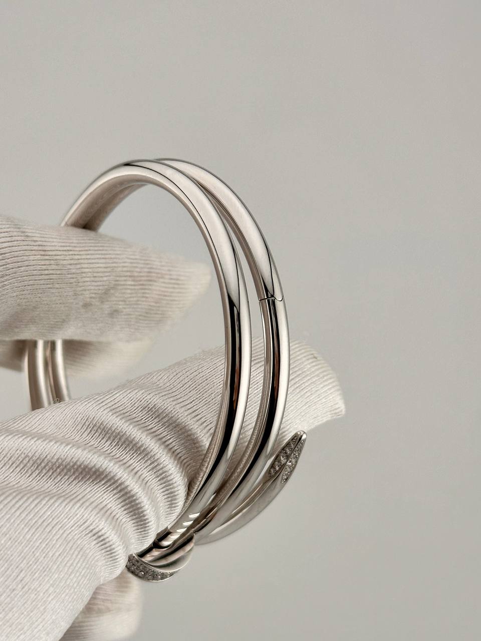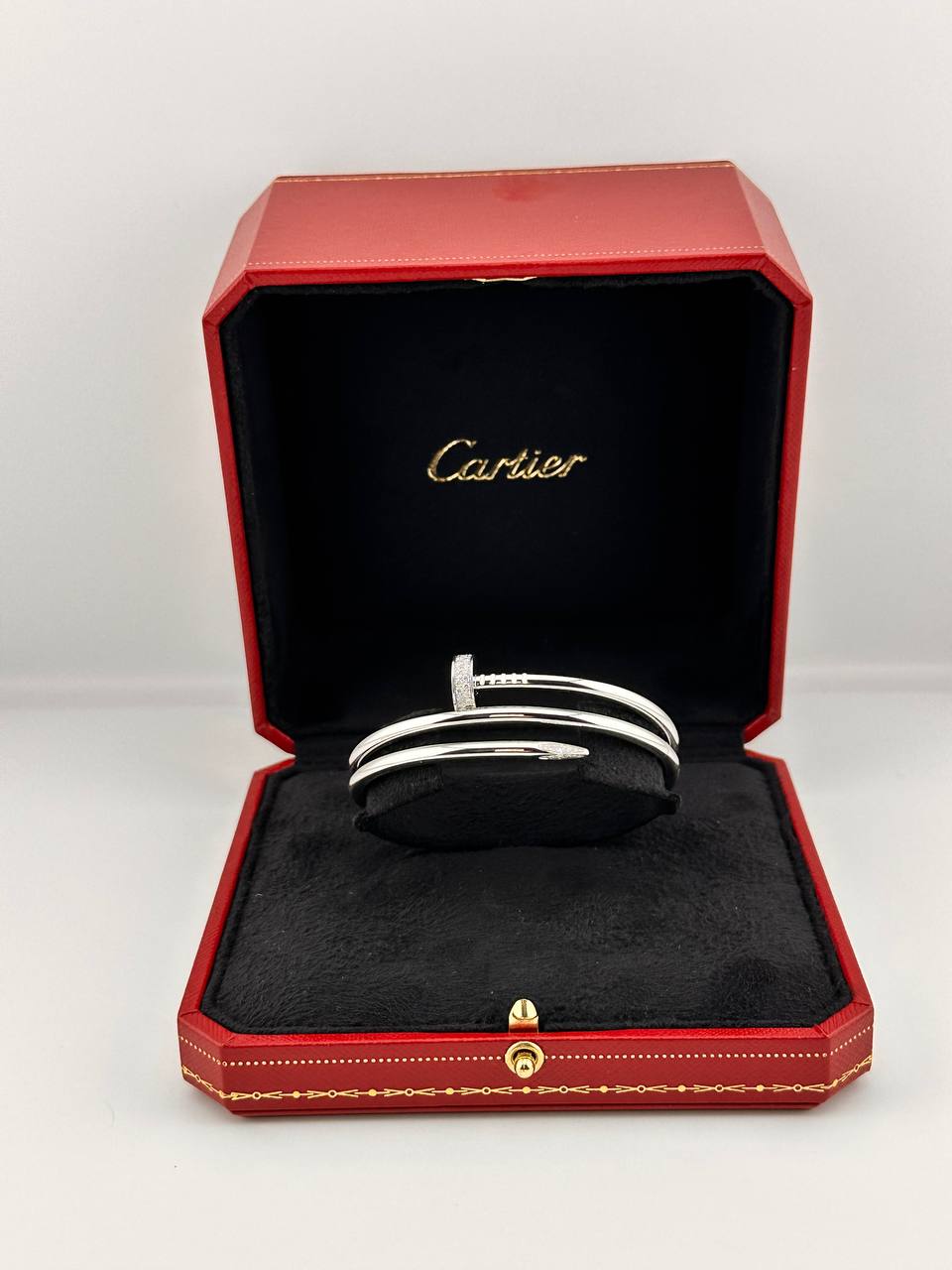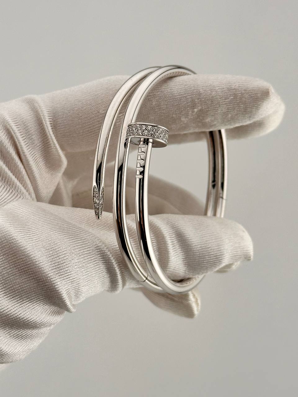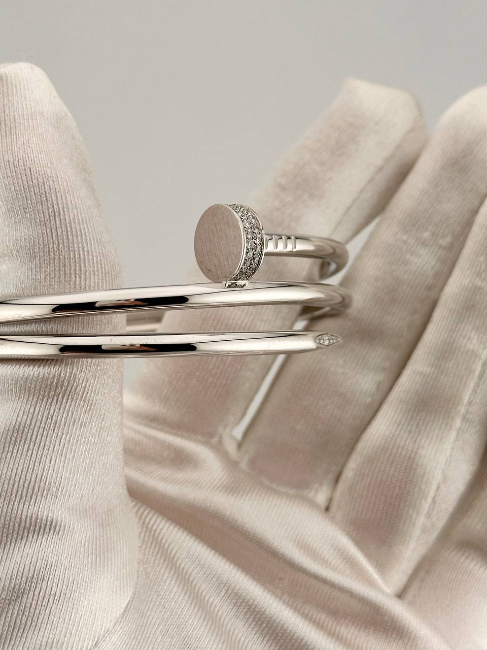 Культовый браслет Cartier Juste Un Clou, выполненный из золота 750 пробы и инкрустированный сияющими бриллиантами.