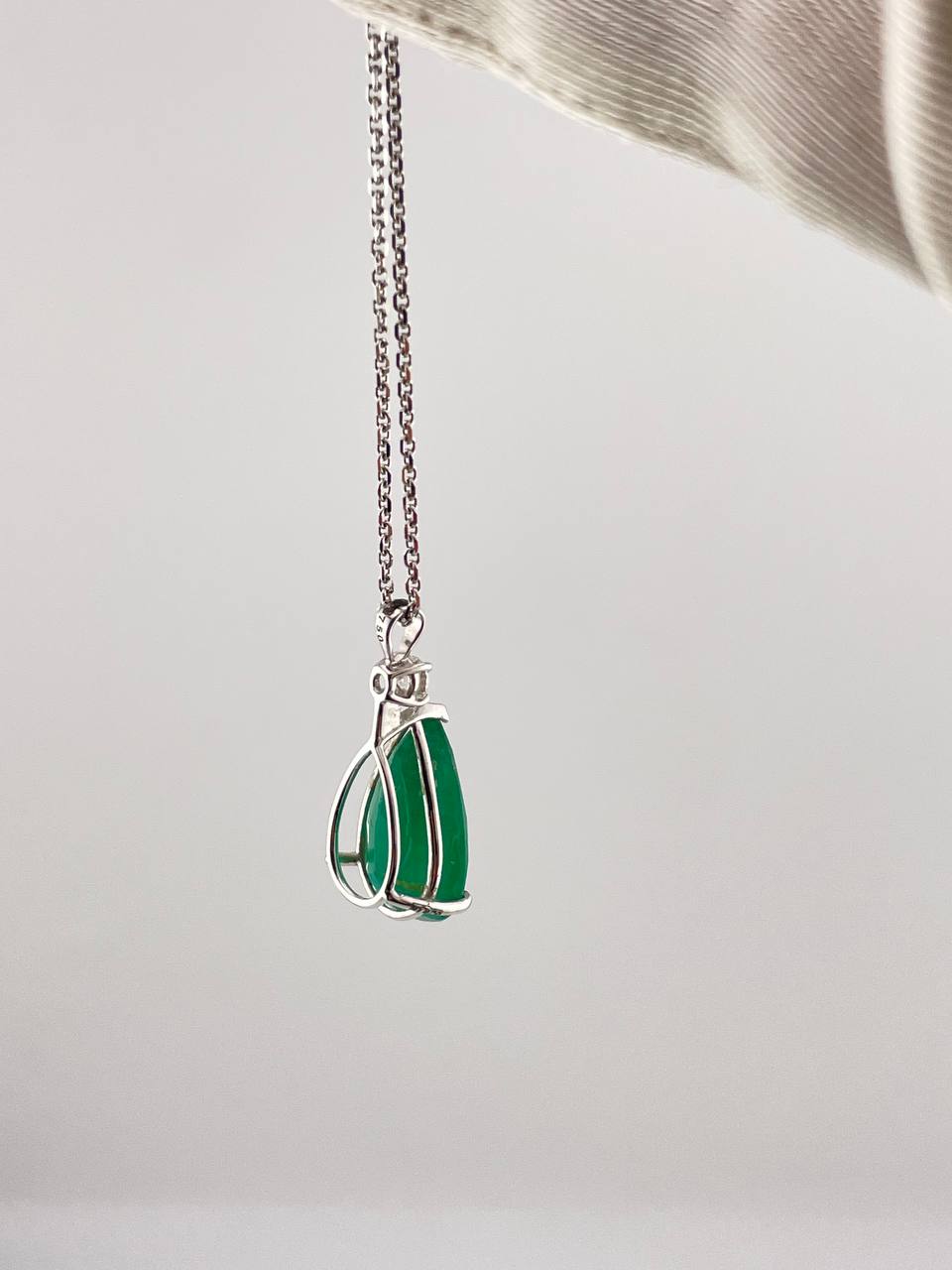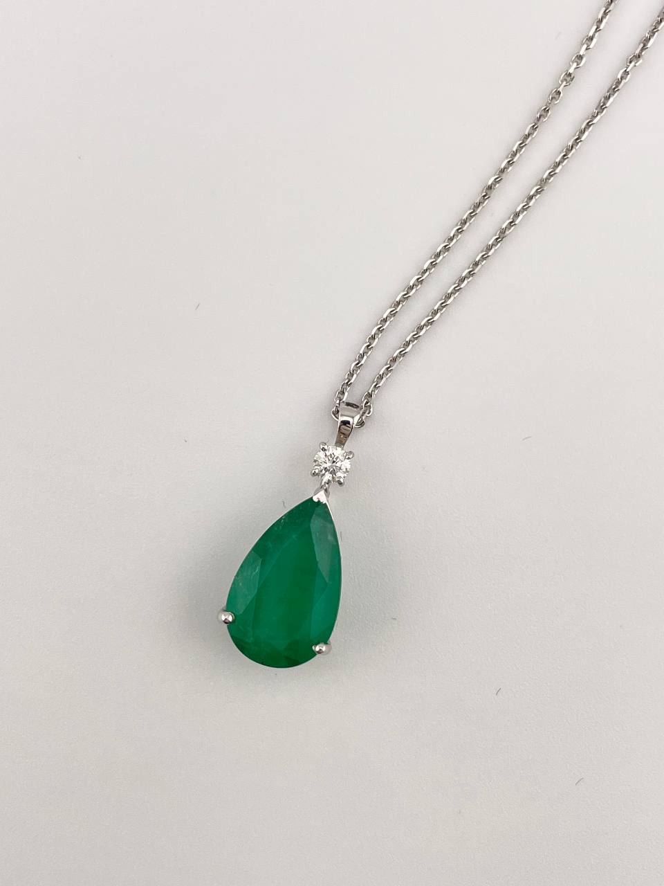 Элегантное колье из золота 750 пробы, инкрустированное роскошным изумрудом 3,08 карат и сверкающими бриллиантами. Вес изделия 4,8 грамма.