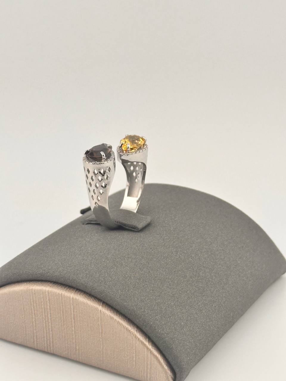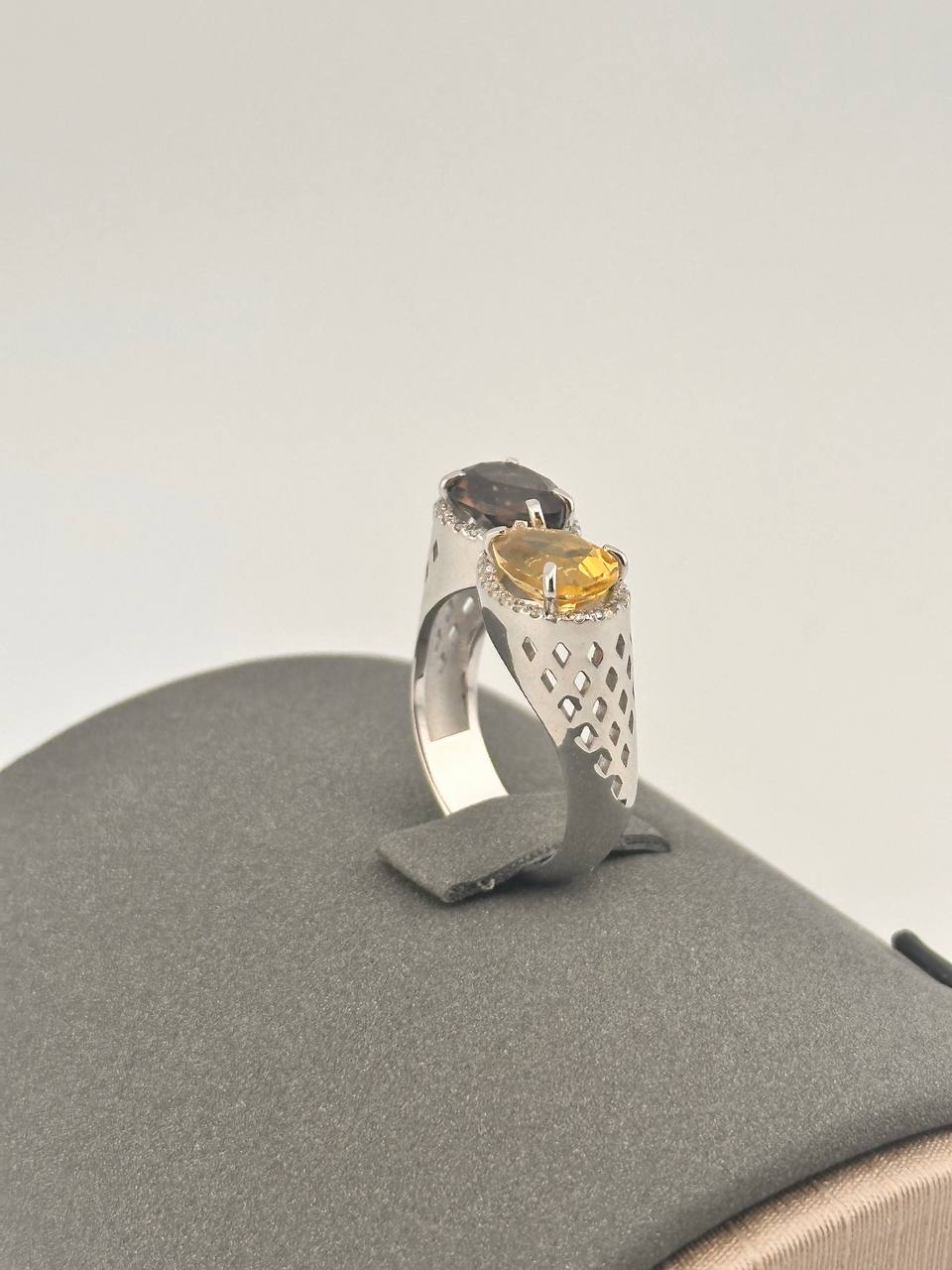 Элегантное золотое кольцо 750 пробы, украшенное цитрином и раухтопазом. Вес 6,43 грамма.
