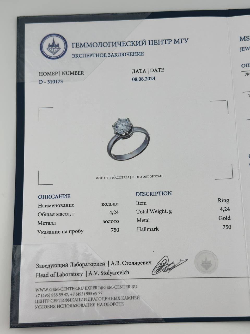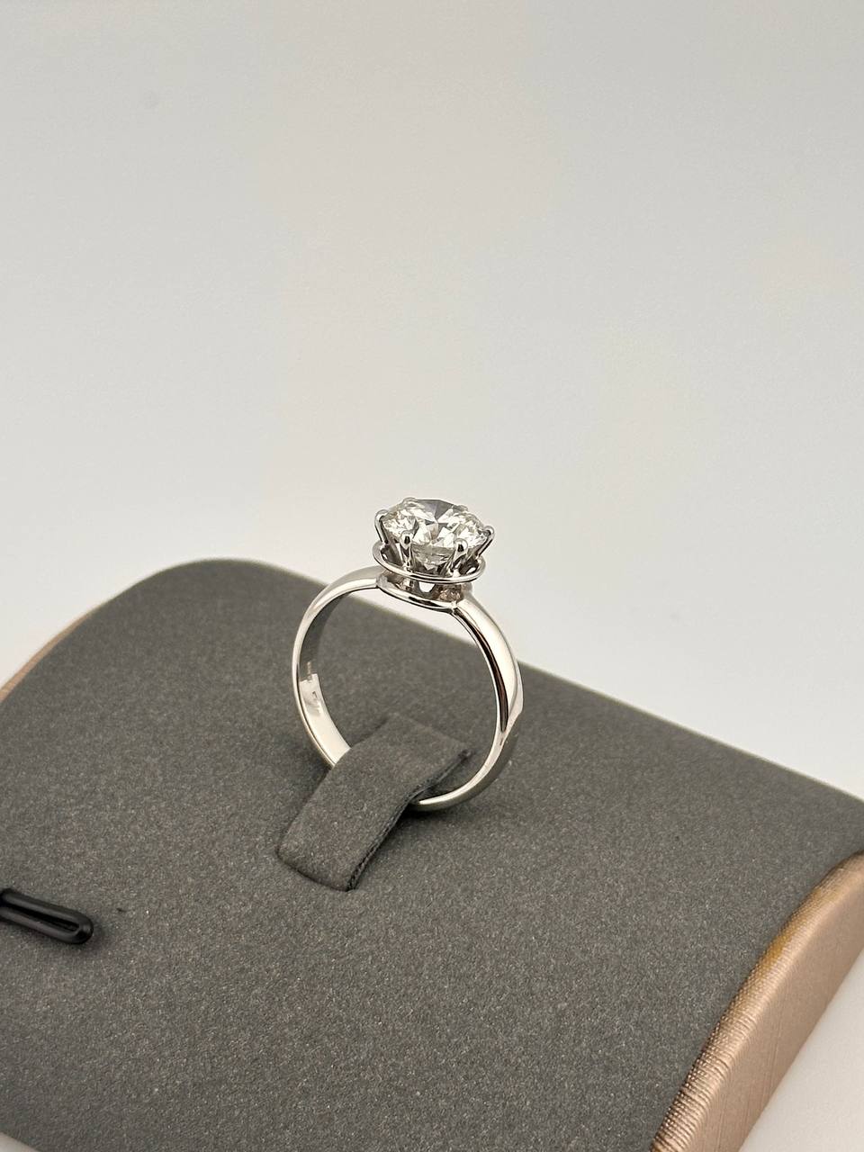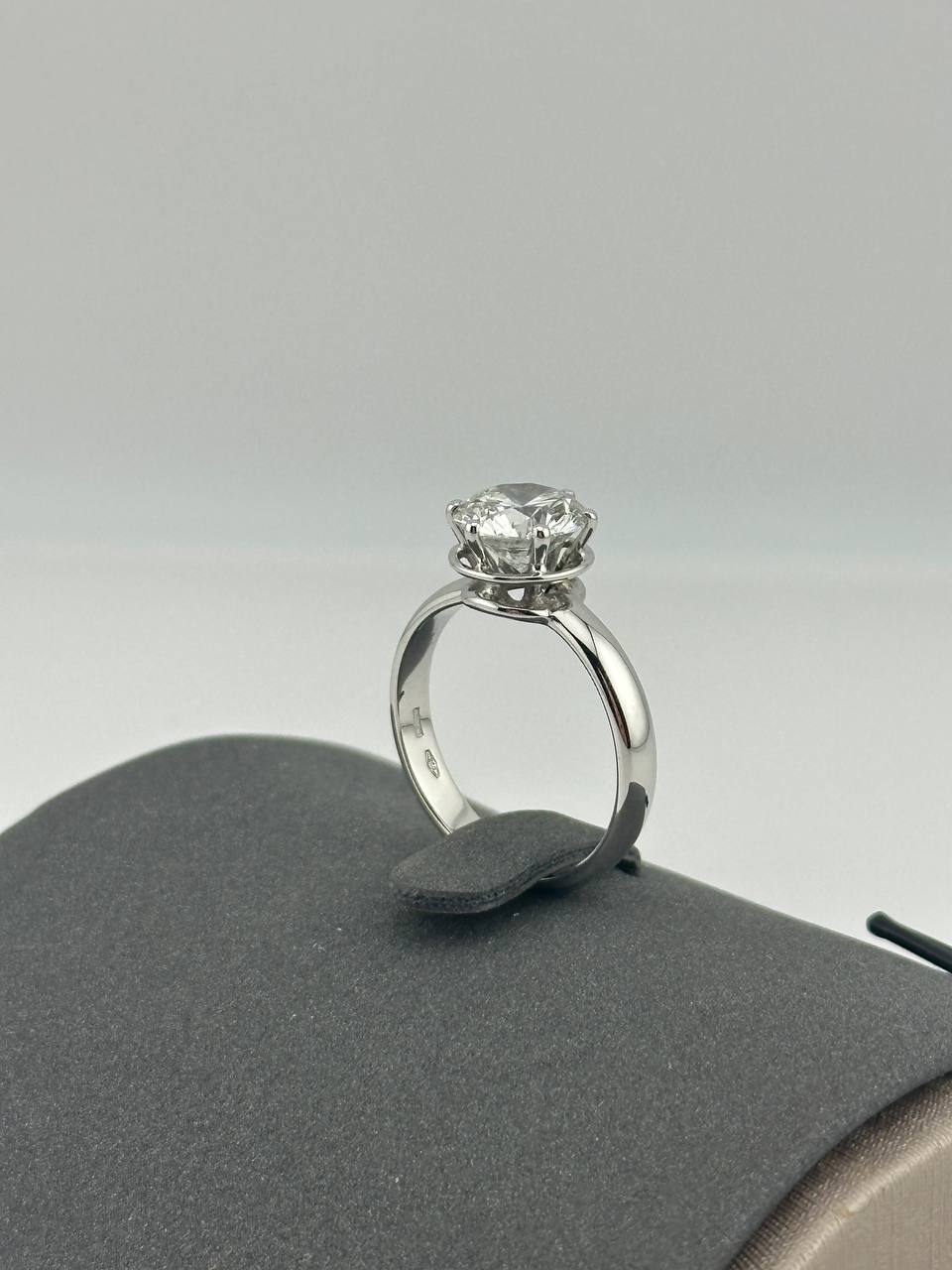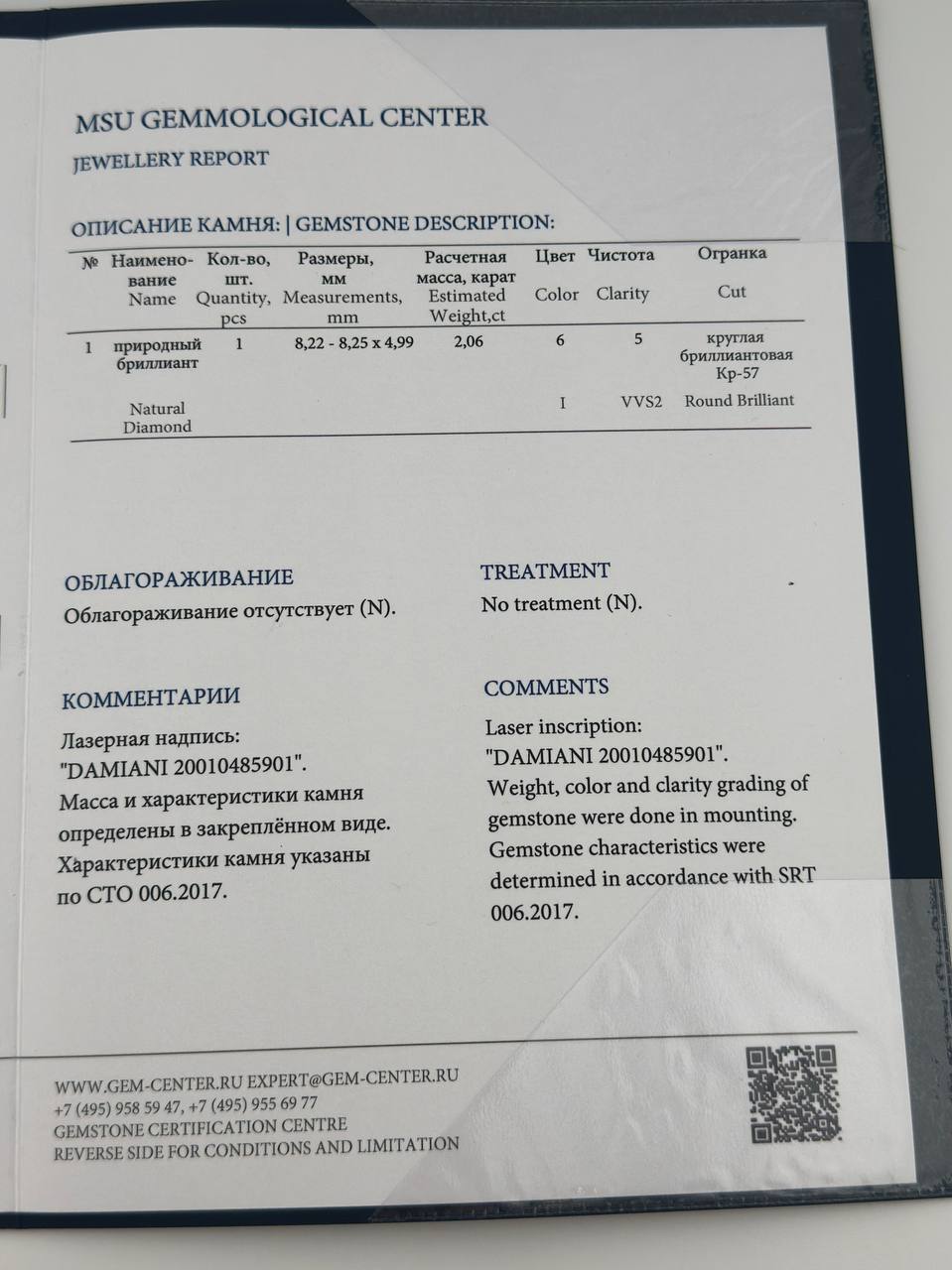 Элегантное кольцо Damiani из золота 750 пробы, украшенное впечатляющим бриллиантом 2,06 карата (чистота VVS2). Вес изделия 4,24 грамма.