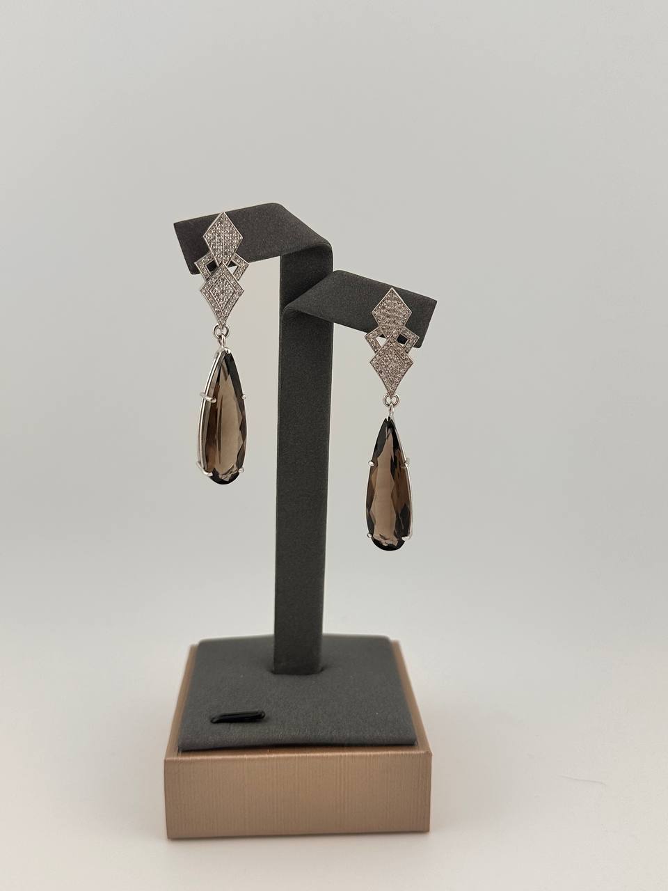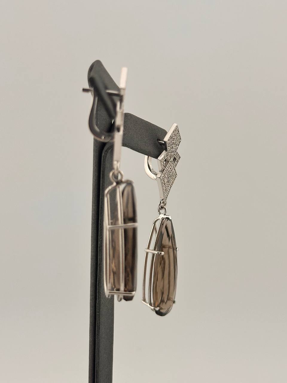 Элегантные золотые серьги-пусеты 750 пробы, инкрустированные бриллиантами и крупными раухтопазами. Общий вес 12,3 грамма.