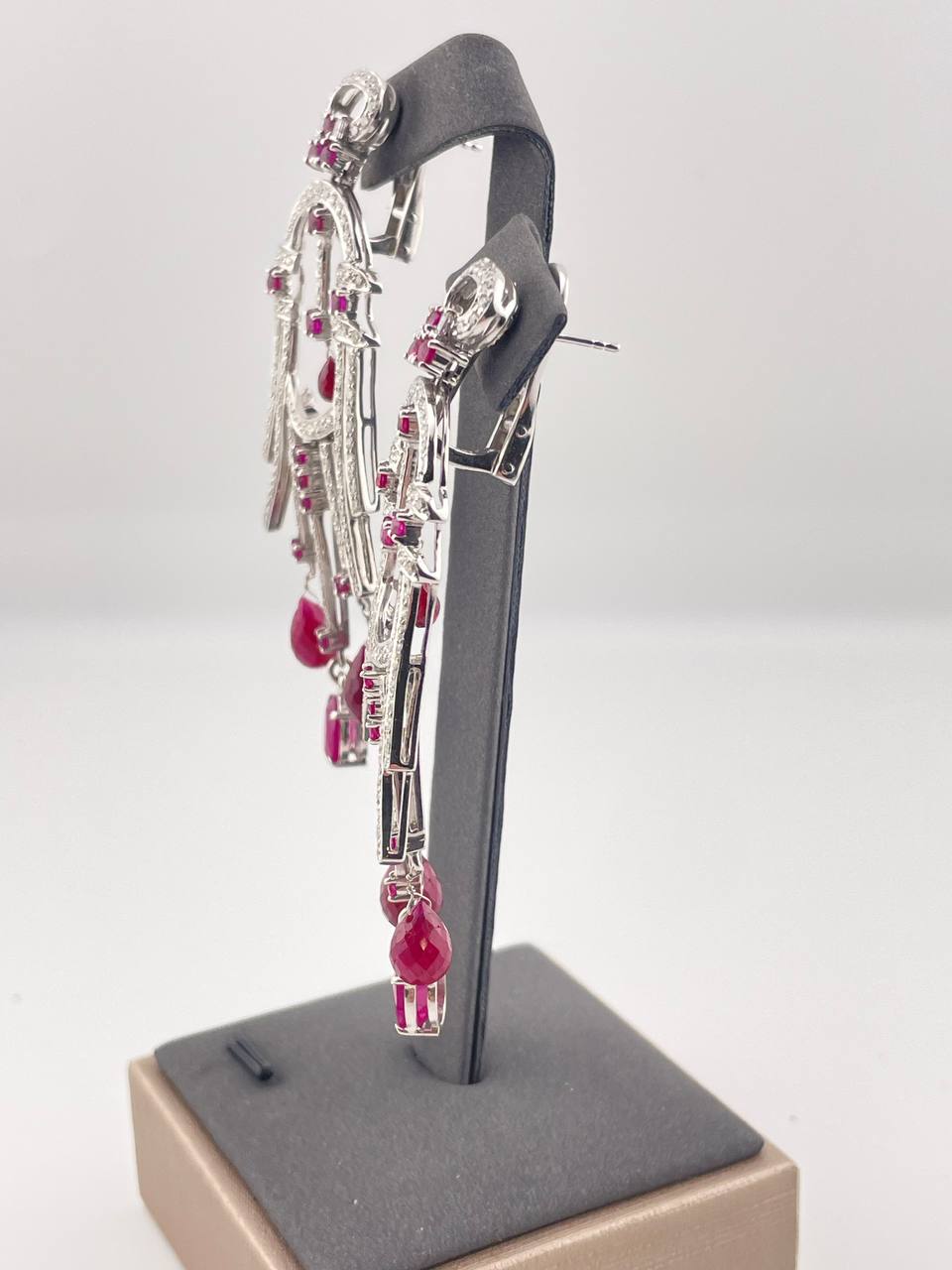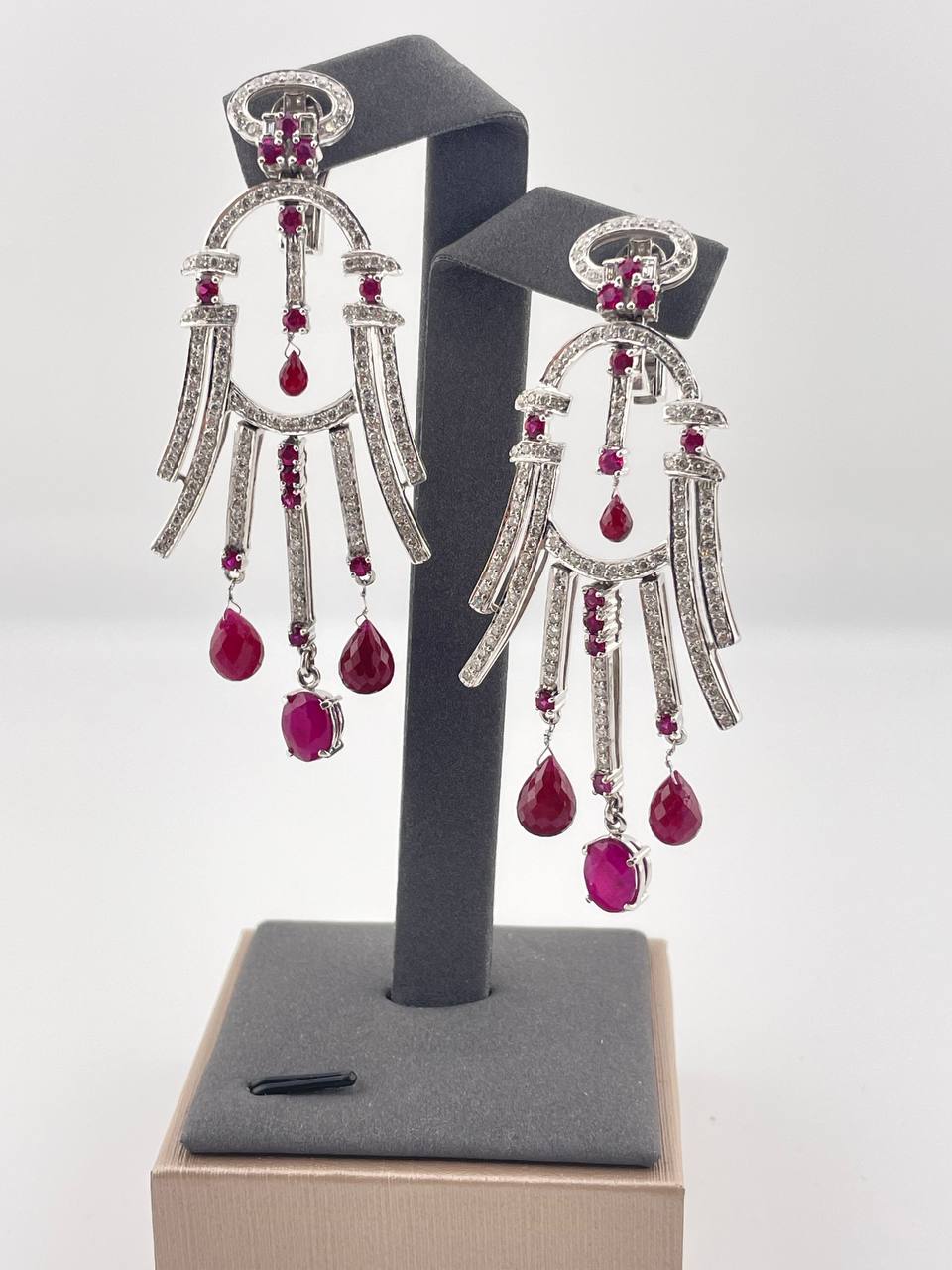 Изысканные вечерние серьги из золота 700 пробы, инкрустированные роскошными рубинами и сияющими бриллиантами. Общий вес изделия 31,7 грамма.