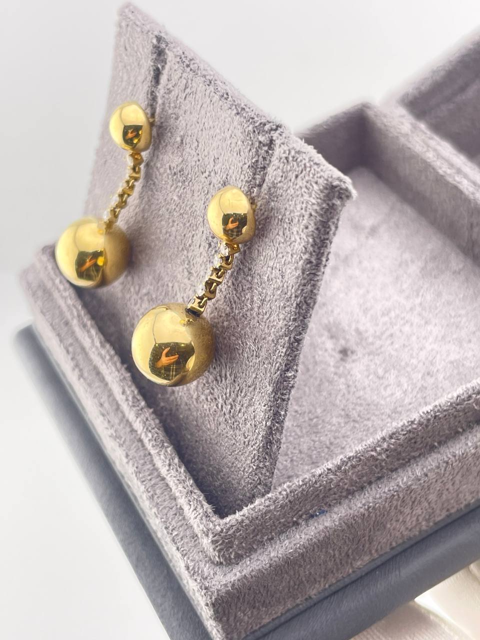 Элегантные золотые серьги 750 пробы в виде шара, инкрустированные сверкающими бриллиантами. Вес 8,85 грамма.