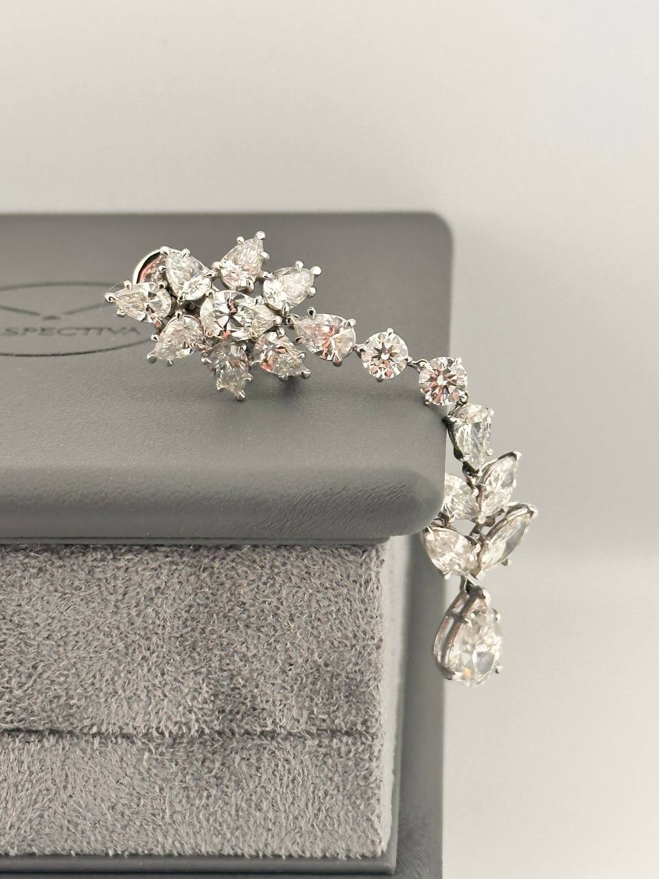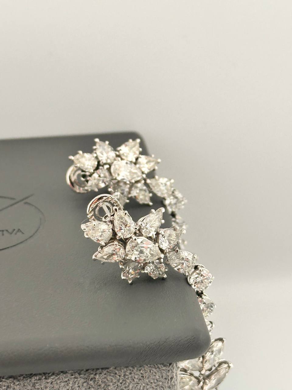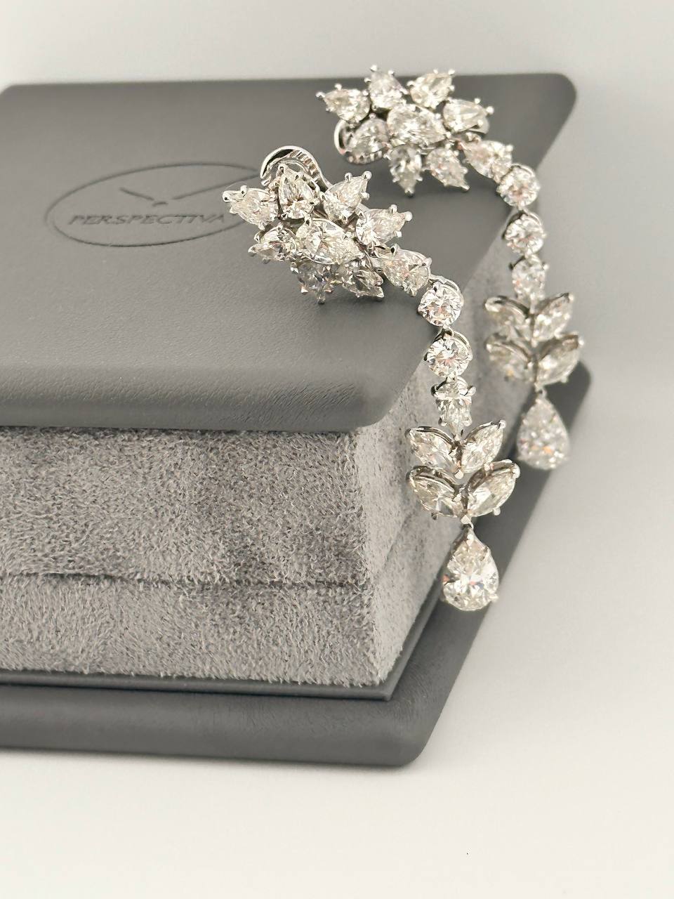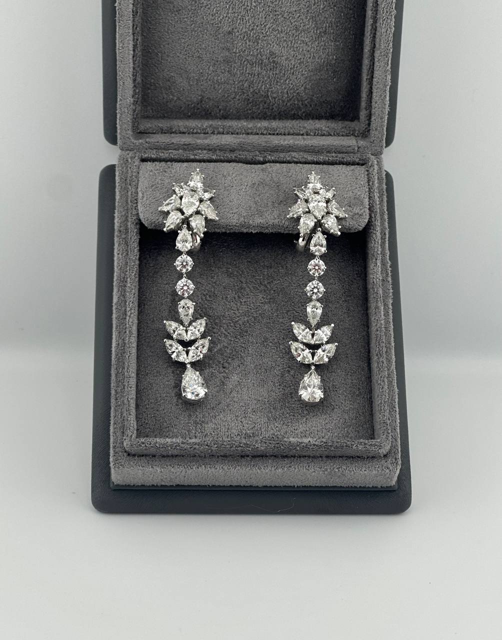 Элегантные серьги из золота 750 пробы, инкрустированные 34 бриллиантами общим весом 14,15 карат. Вес изделия 18,45 грамма.