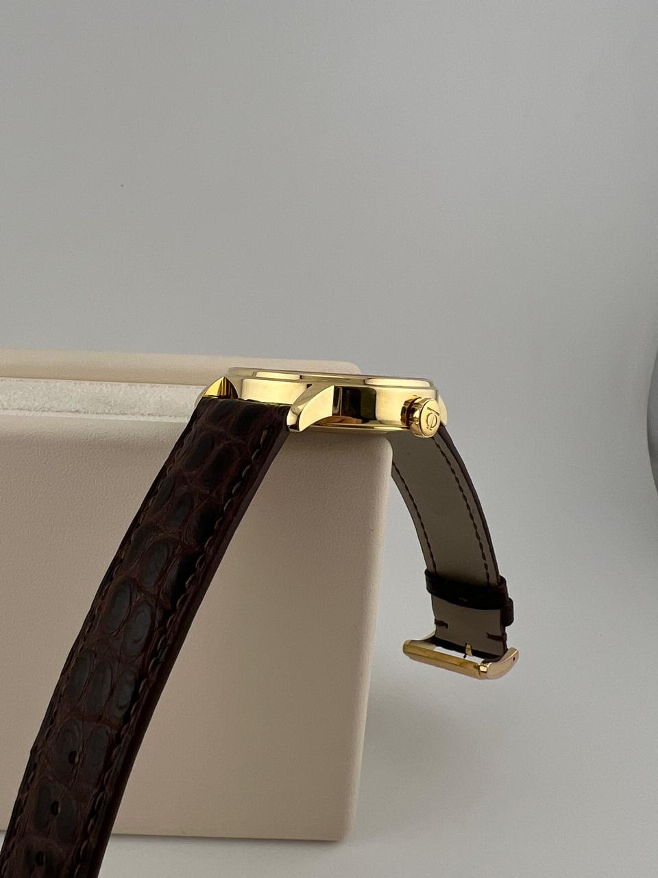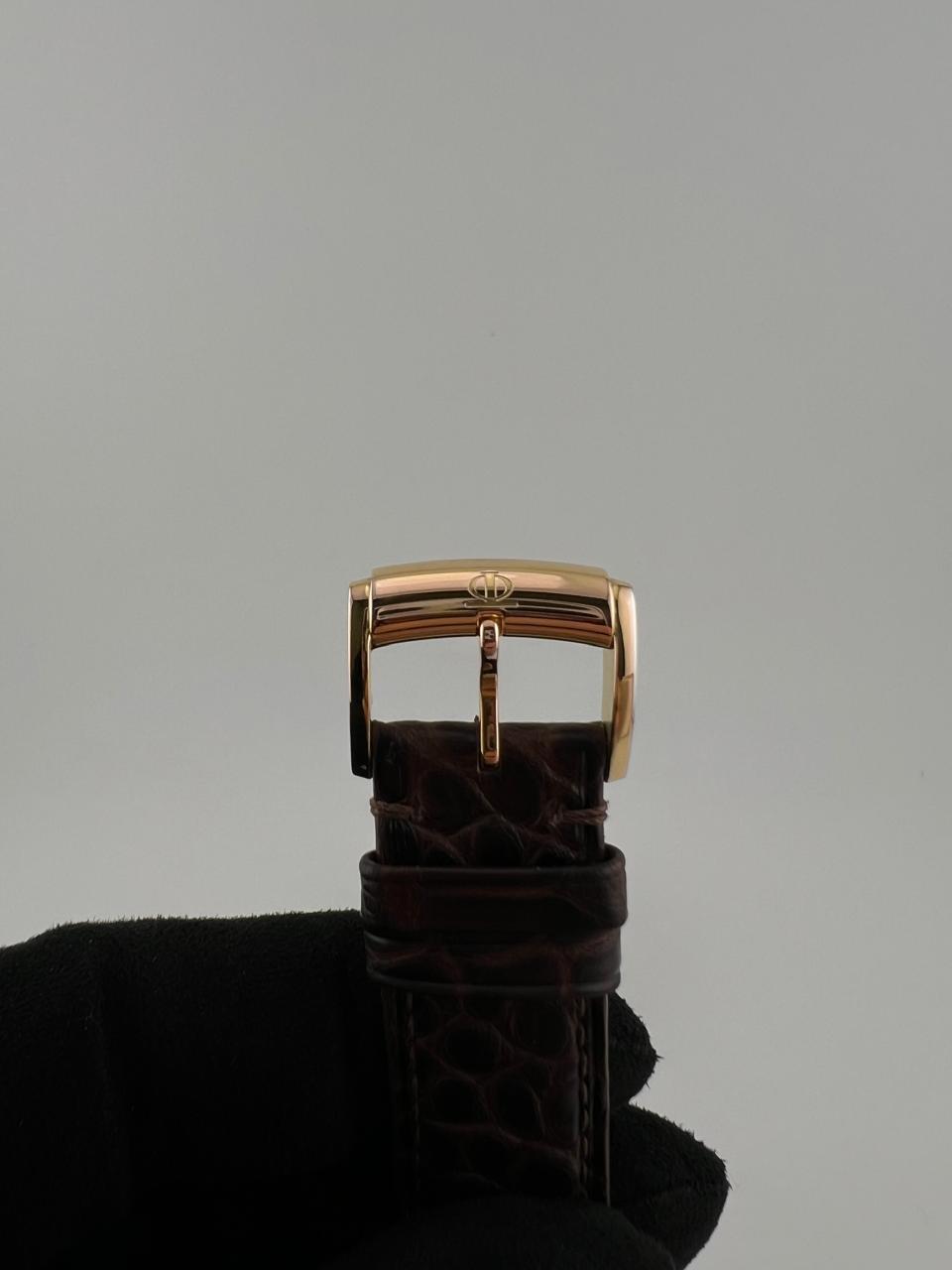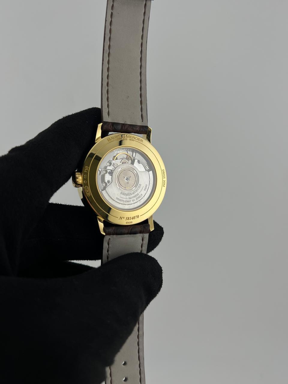 Элегантные швейцарские часы Baume & Mercier с автоподзаводом. Корпус диаметром 39 мм выполнен из золота 750 пробы, дополнен классическим кожаным ремешком. REF 65630.