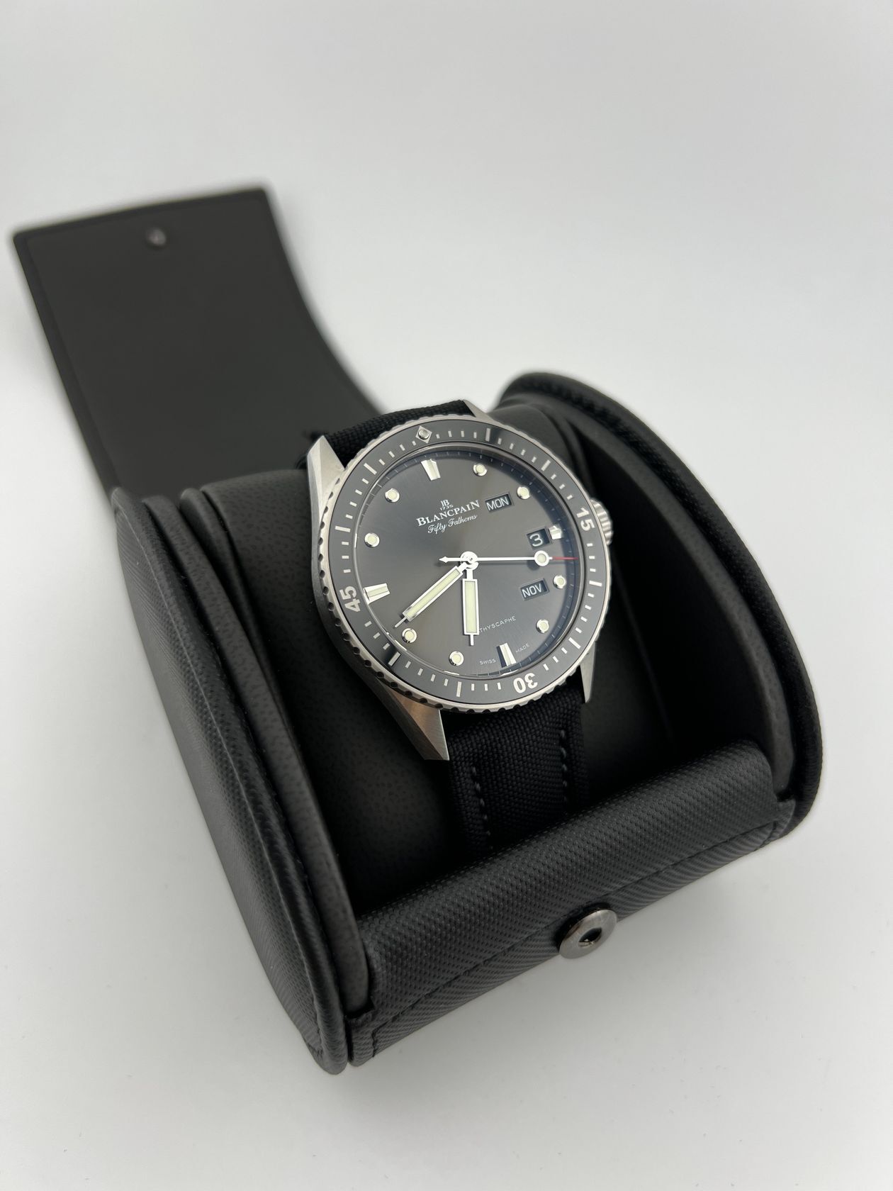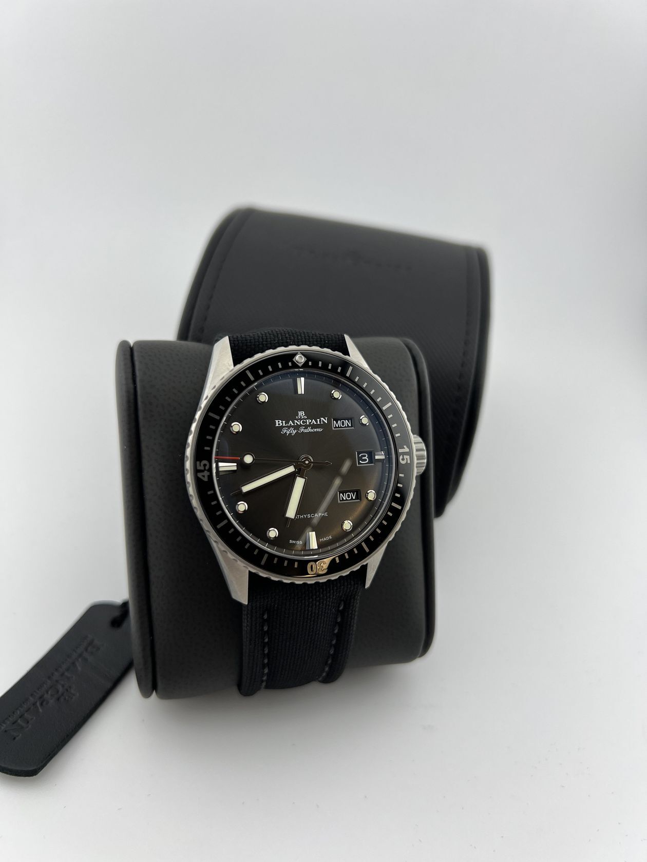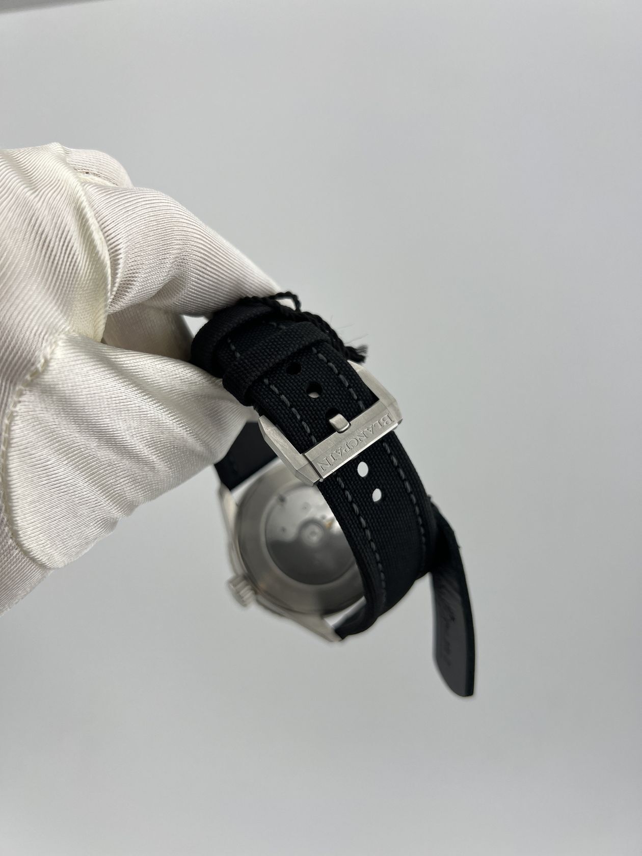 Культовые часы Blancpain Fifty Fanthoms в корпусе из стали, диаметром 43 мм. Модель оснащена надежным автоматическим механизмом и дополнена прочным ремешком из парусины, представляя идеальное сочетание дайверской классики и современных материалов.