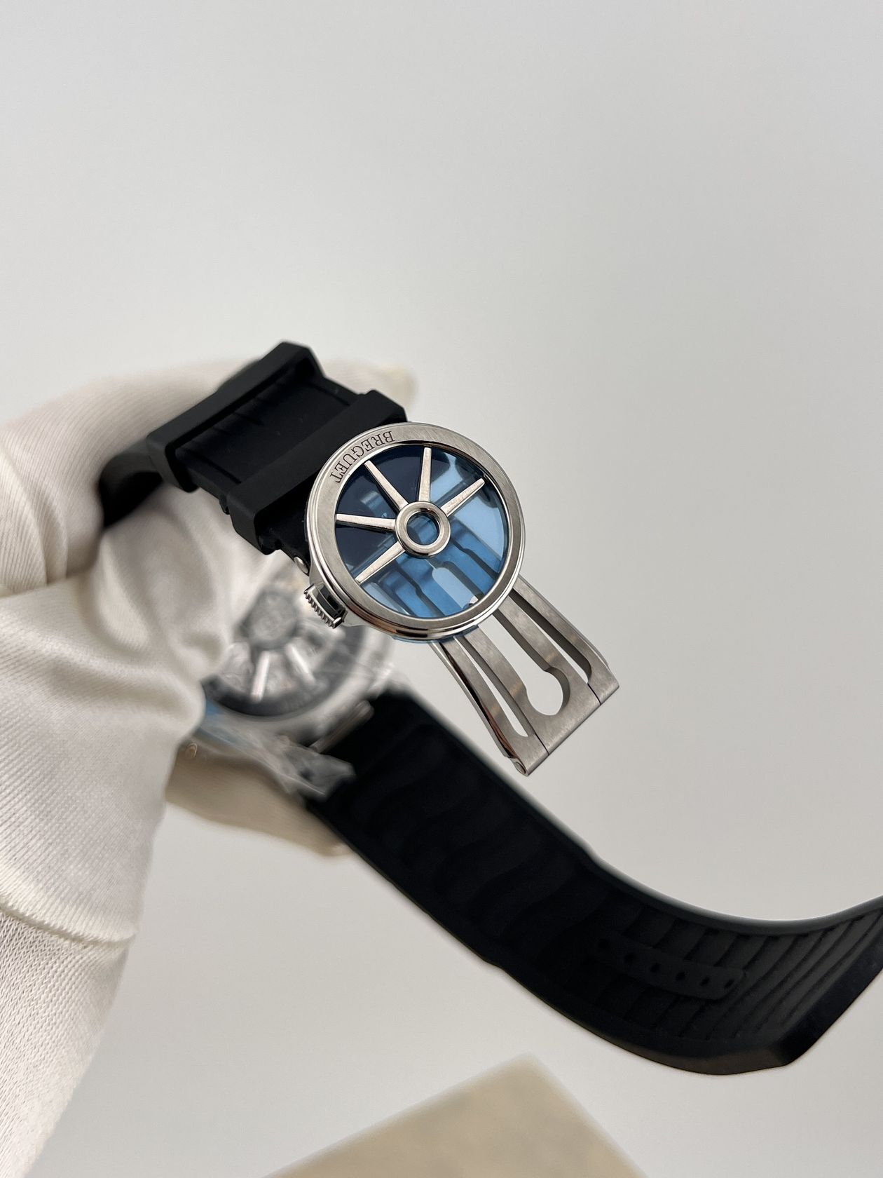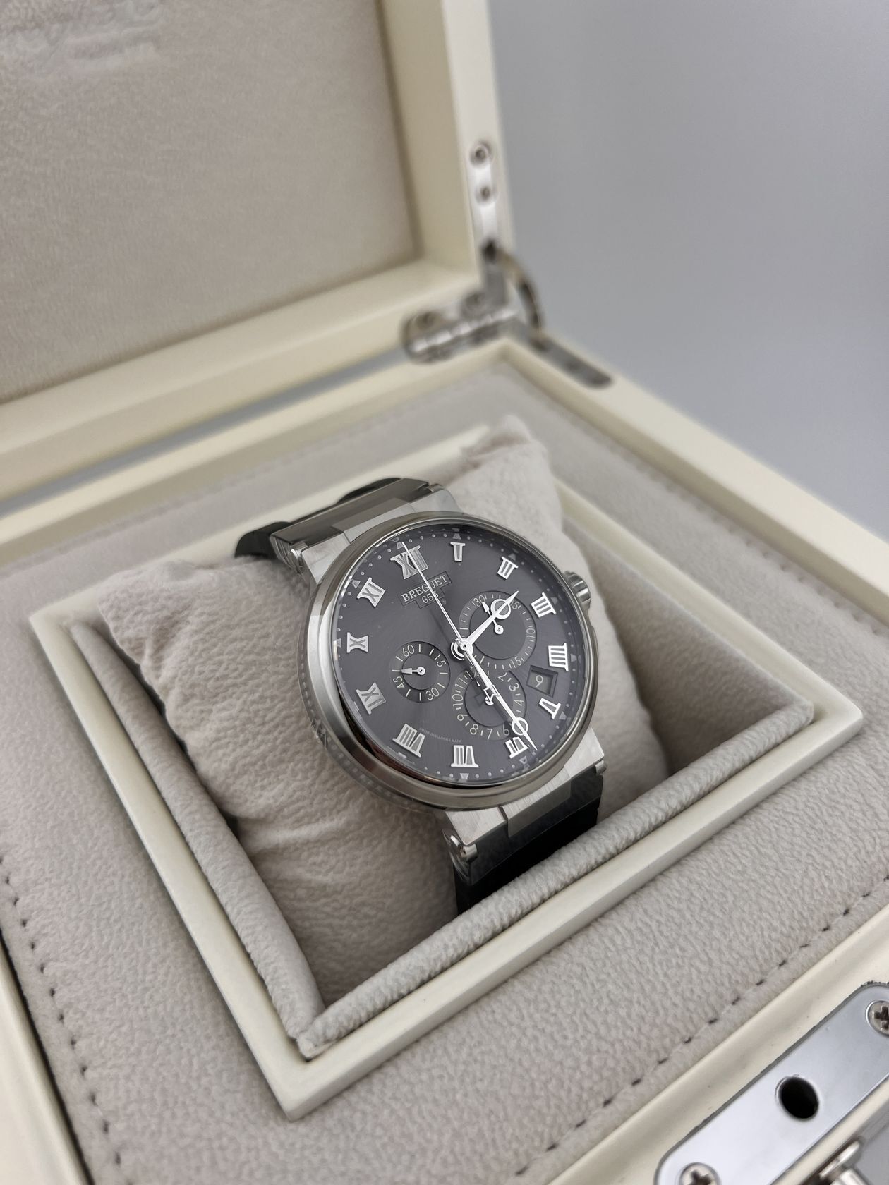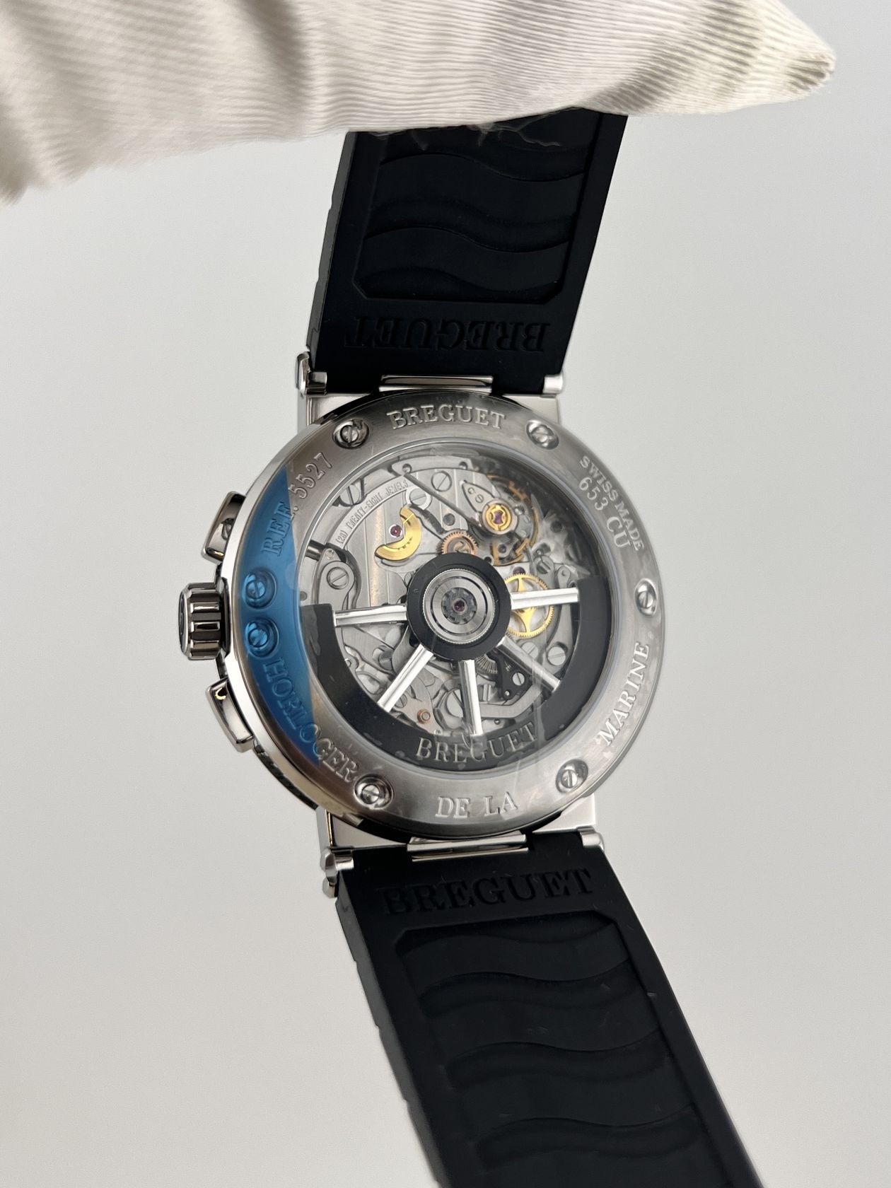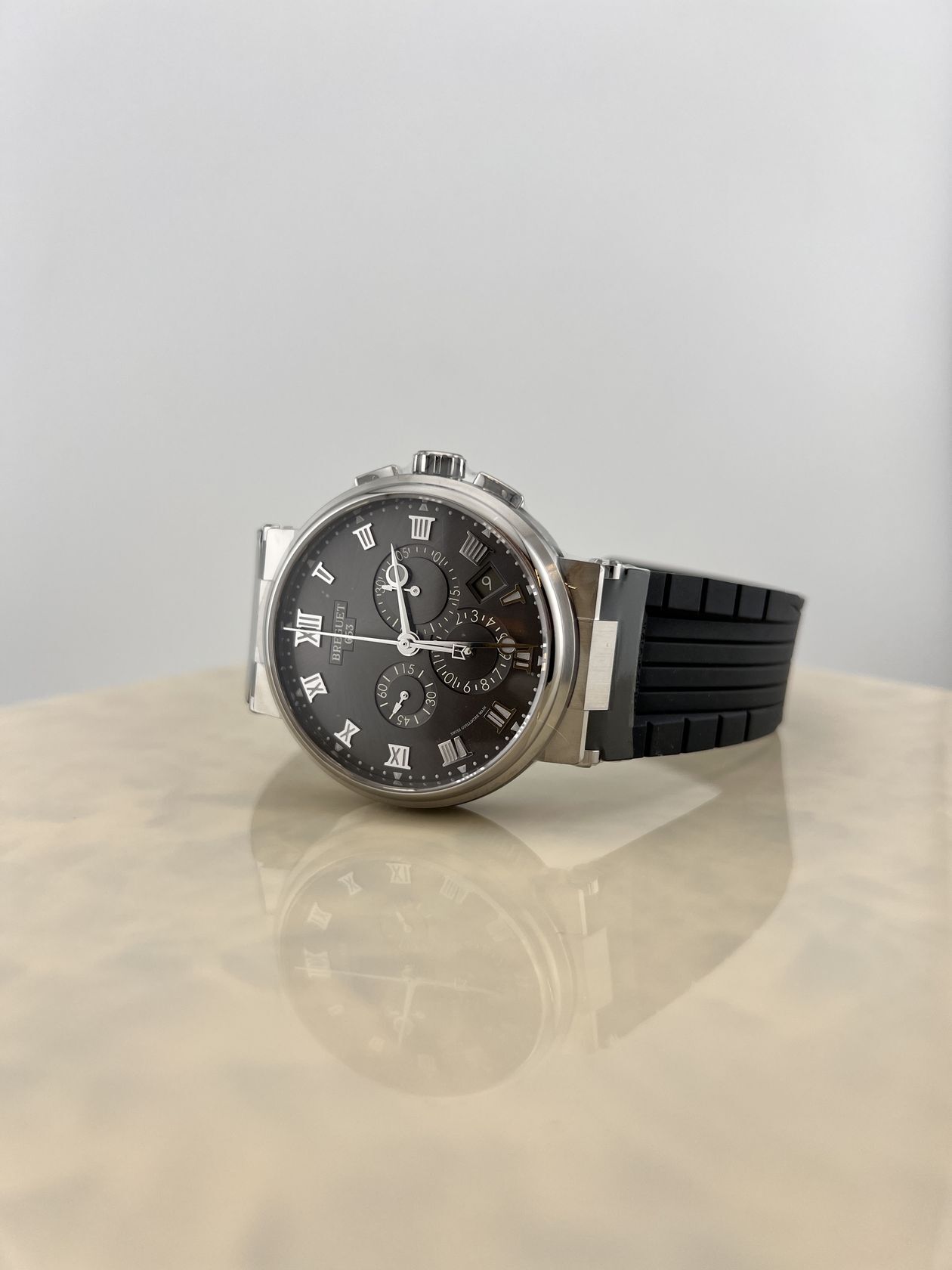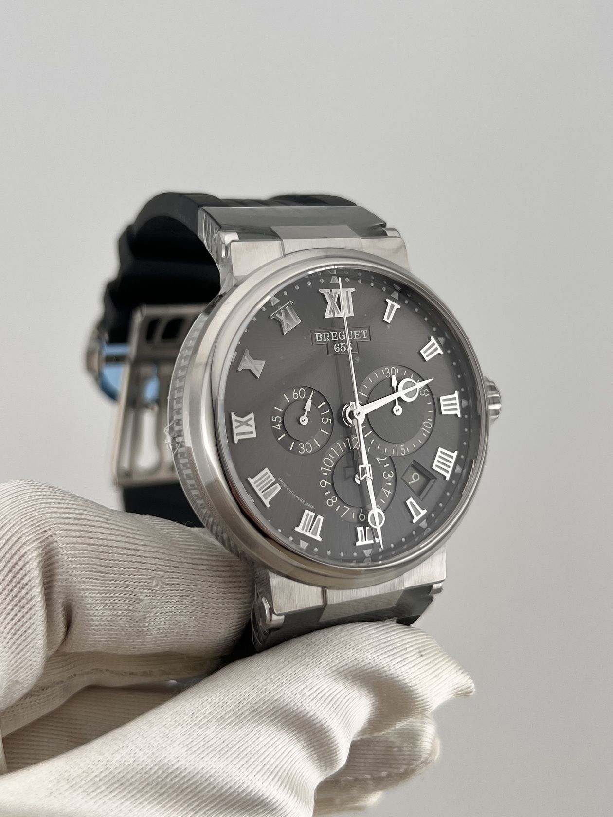 Культовый хронограф Breguet Marine в корпусе из стали, диаметром 42.5 мм. Часы оснащены надежным автоматическим механизмом и дополнены удобным каучуковым ремешком, представляя идеальное сочетание спортивного стиля и швейцарского мастерства.