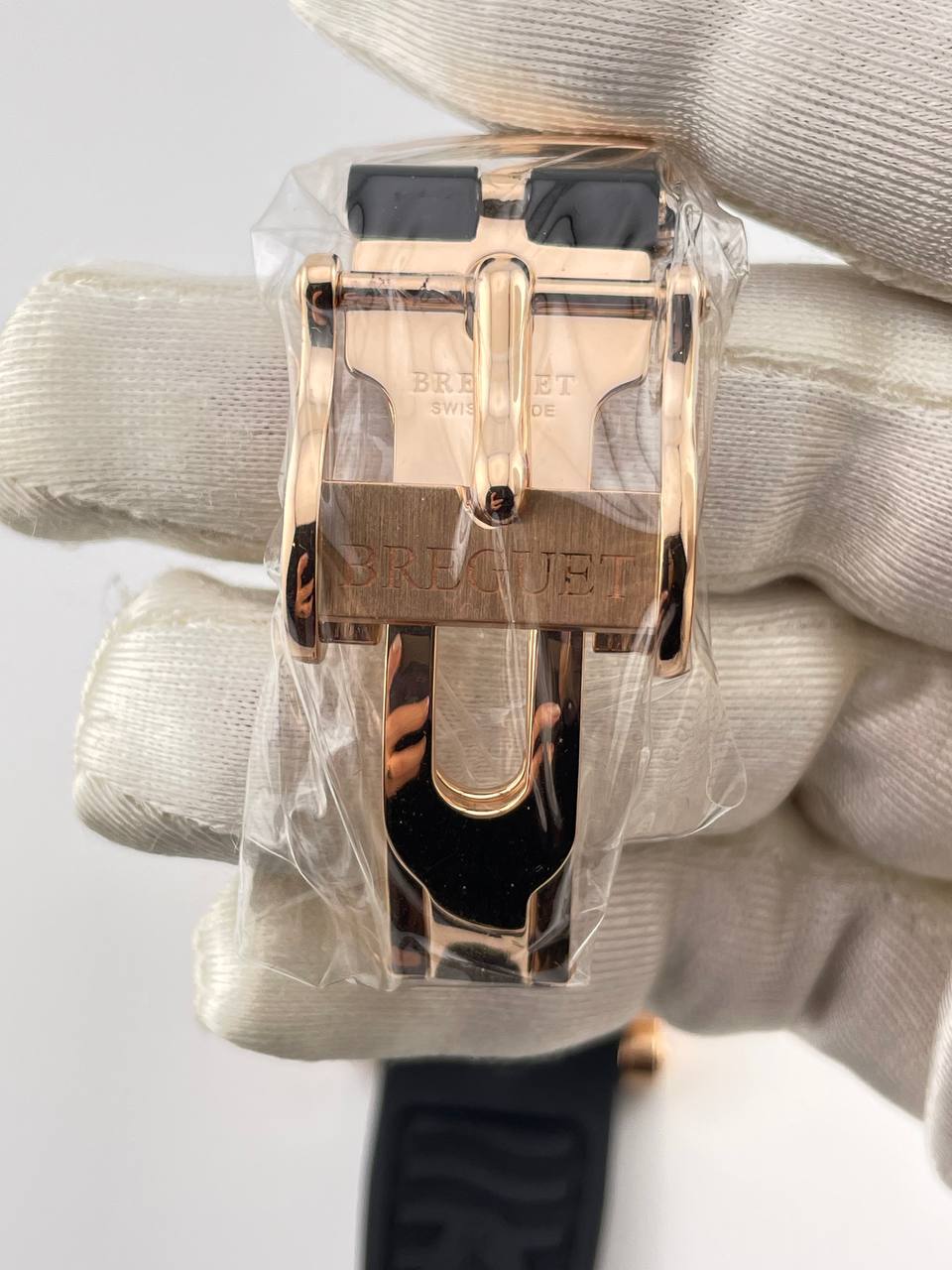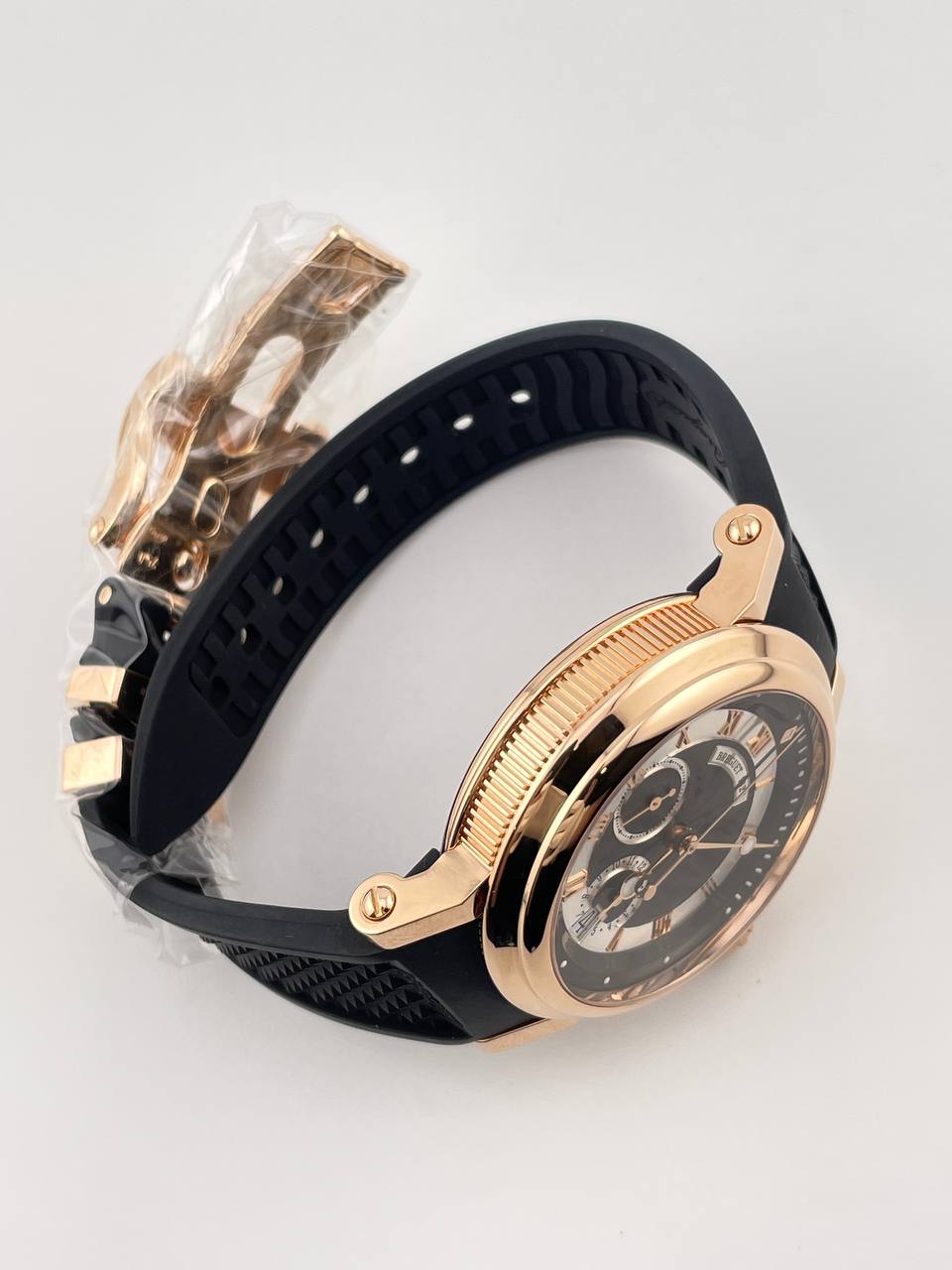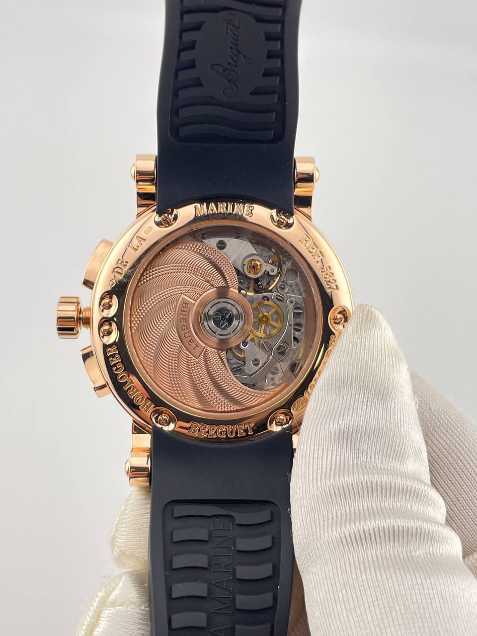 Культовый хронограф Breguet Marine в корпусе из золота, диаметром 43 мм. Часы оснащены надежным автоматическим механизмом и дополнены спортивным каучуковым ремешком, представляя идеальное сочетание роскоши и динамичного стиля.