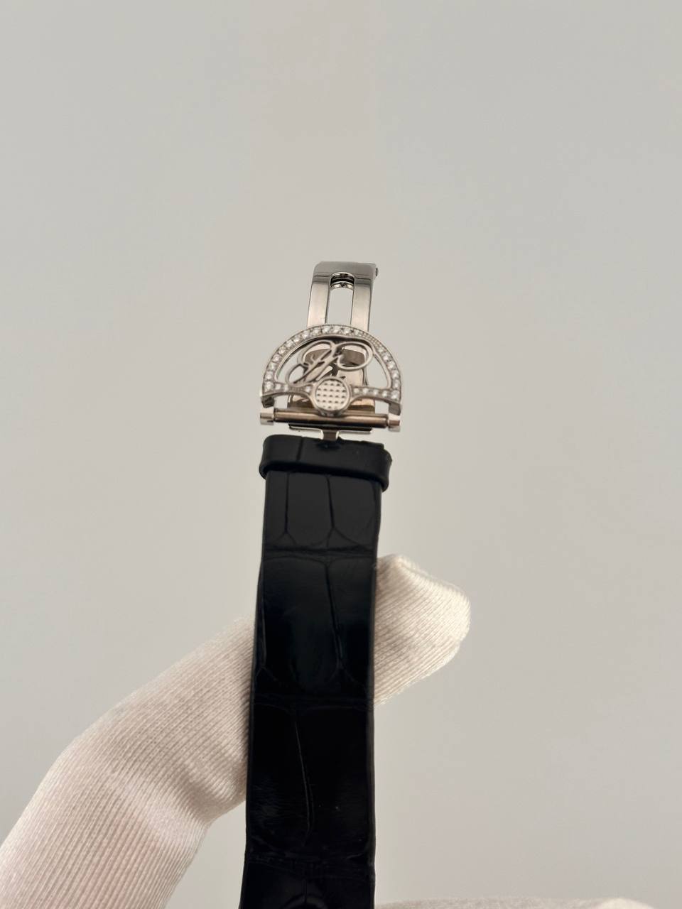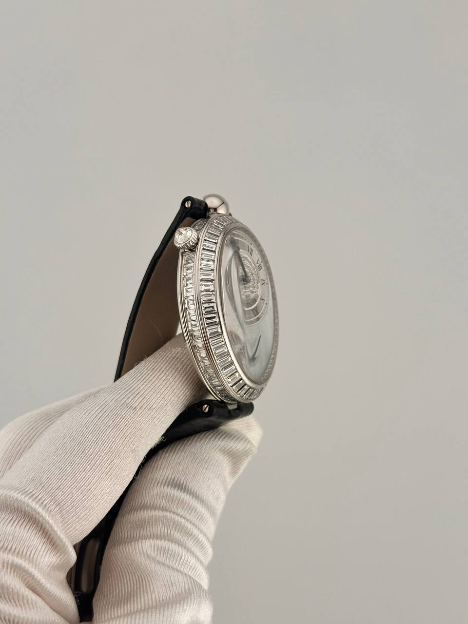 Роскошные женские часы Breguet Reine De Naples Phase de Lune 8909. Модель в золотом корпусе размером 38.5 x 30.5 мм с автоподзаводом, оснащена индикатором лунной фазы и запаса хода. Корпус и циферблат инкрустированы бриллиантами, дополнены элегантным кожаным ремешком.