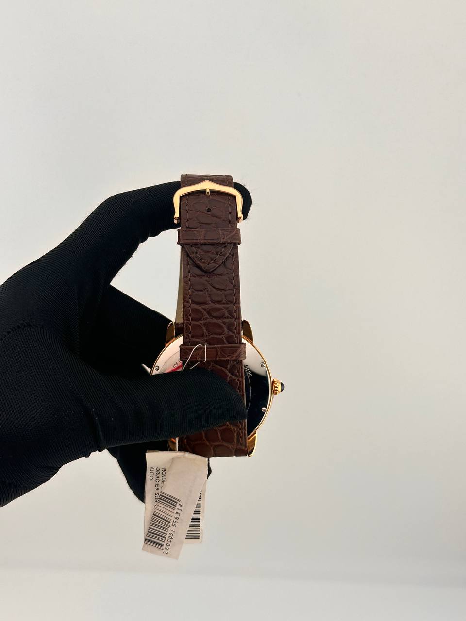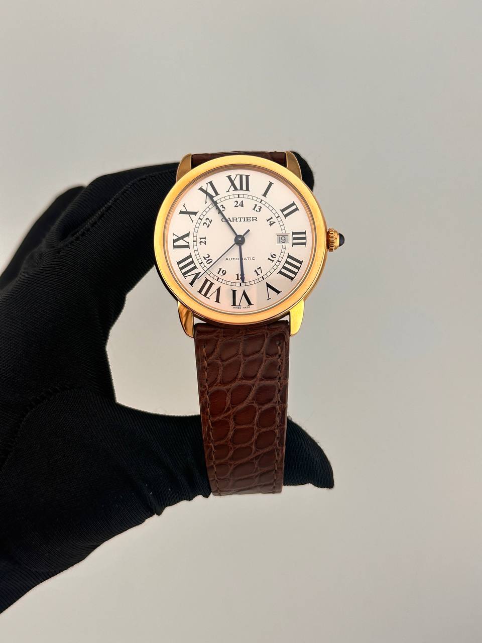 Мужские часы Cartier Ronde Solo XL, референс W6701009. Корпус 42 мм из 18-каратного розового золота и стали с автоподзаводом. Серебристый циферблат с римскими цифрами и указателем даты. Элегантный ремешок из кожи аллигатора дополнен застежкой из розового золота.