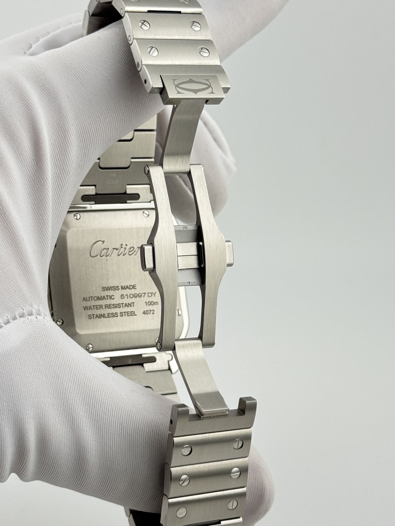 Культовые часы Cartier Santos (ref. WSSA0062) в крупном корпусе из нержавеющей стали (39.8 x 47.5 мм). Модель оснащена надежным автоматическим механизмом и дополнена элегантным зеленым циферблатом и стальным браслетом, представляя собой идеальное сочетание классики и современного стиля.