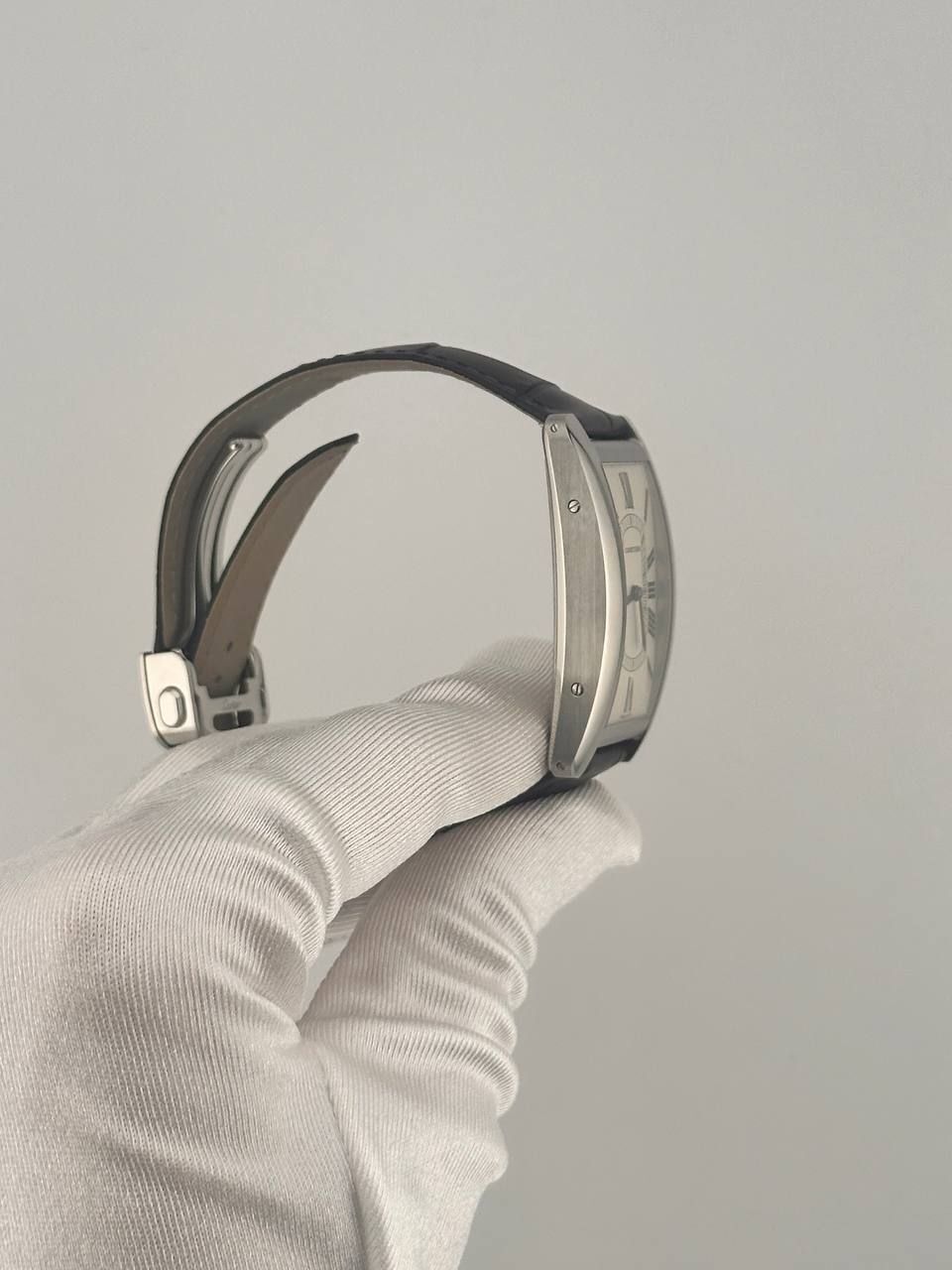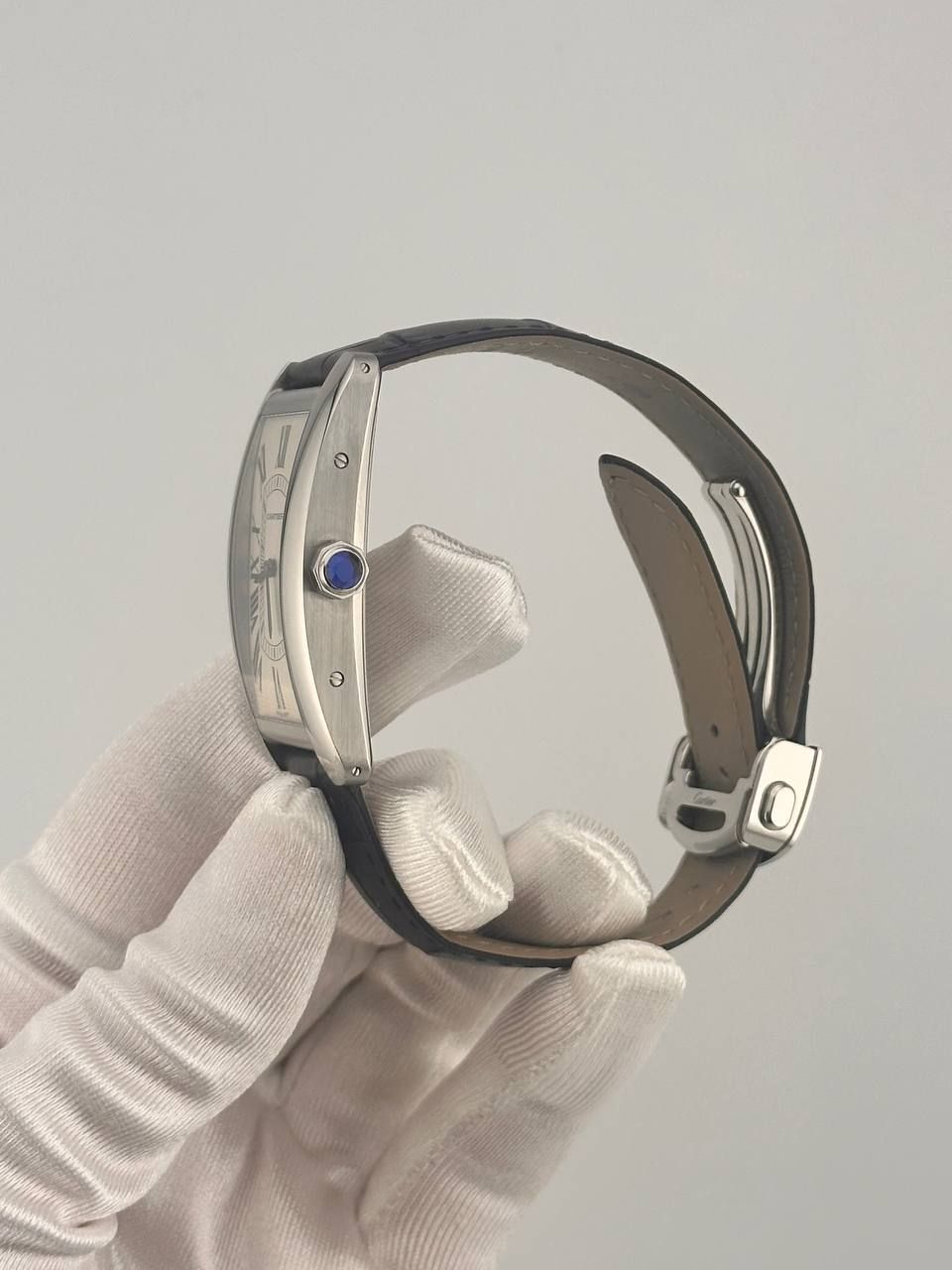 Культовые часы Cartier Tank Américaine, крупная модель (Ref. WSTA0083). Корпус из стали размером 44,4 x 24,4 мм оснащен автоматическим механизмом с автоподзаводом. Серебристый циферблат дополнен синеными стрелками-мечами и элегантным ремешком из кожи аллигатора темно-синего цвета. Водонепроницаемость 30 метров.