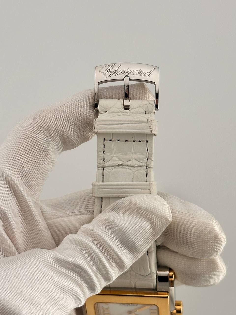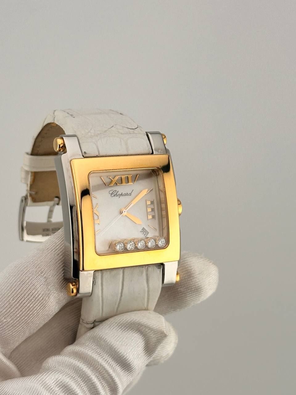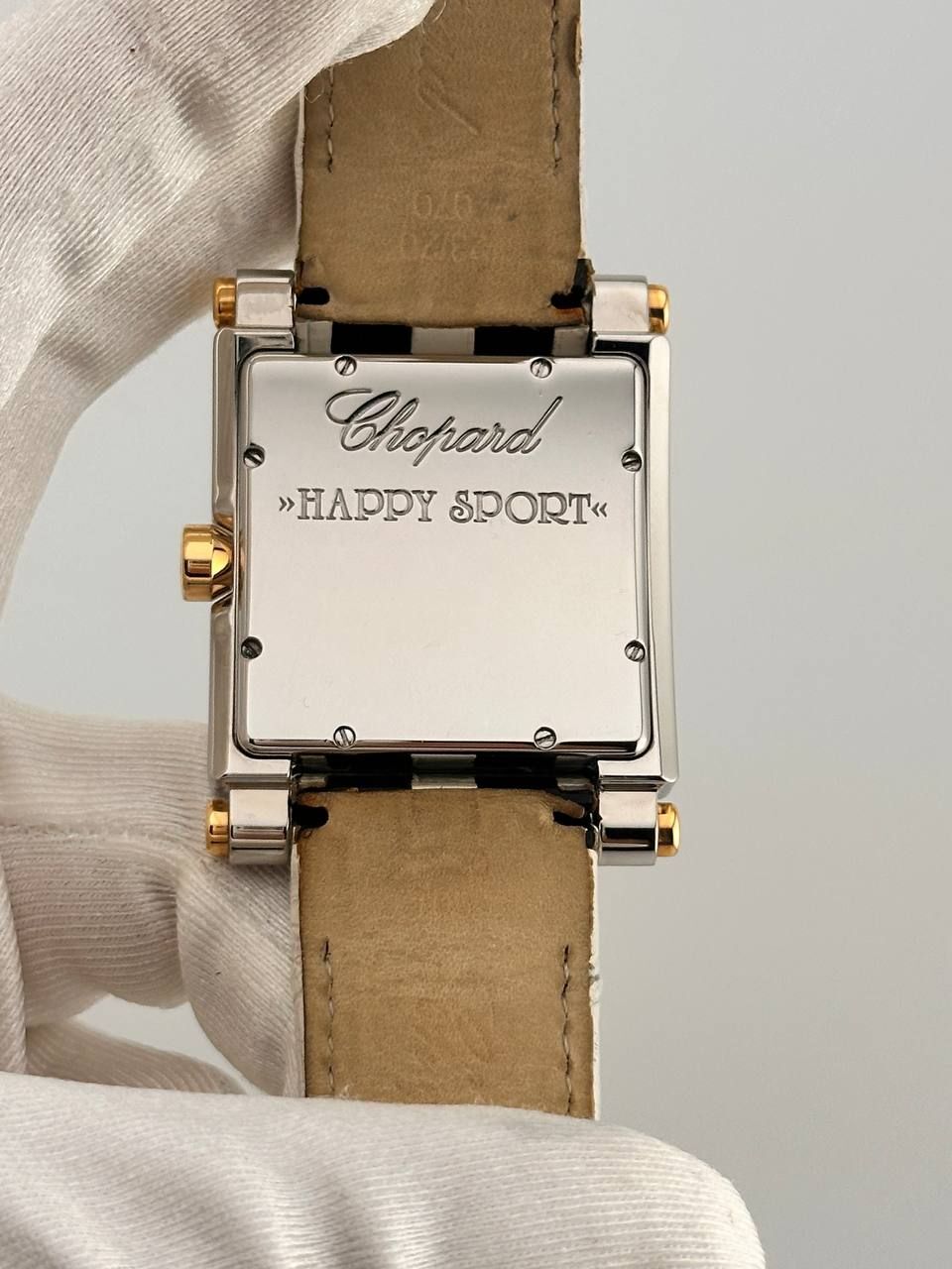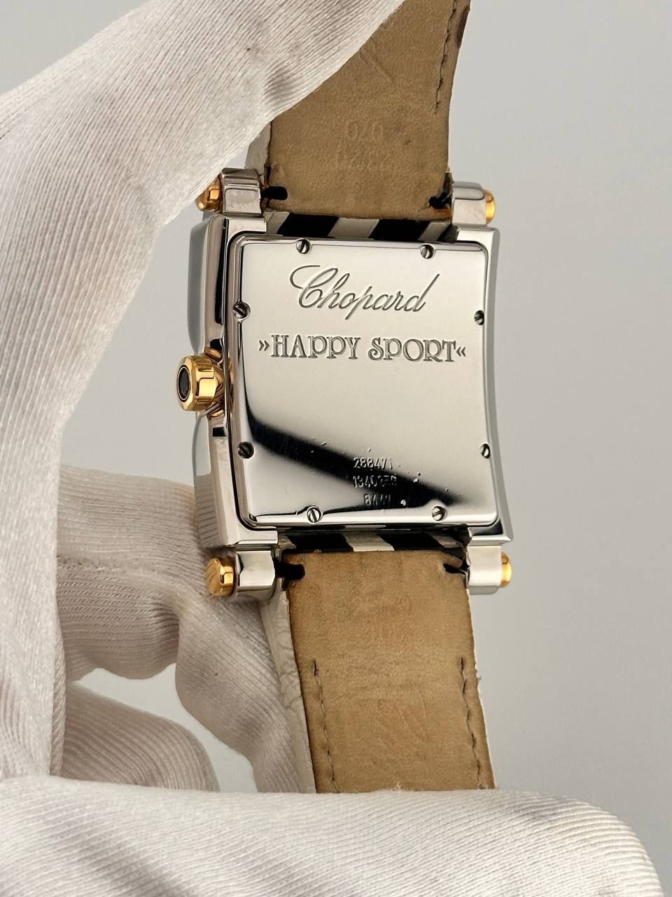 Элегантные женские часы Chopard Happy Sport (35 х 30 мм) в комбинированном корпусе из стали и золота 750 пробы. Модель оснащена надежным кварцевым механизмом и дополнена классическим кожаным ремешком.