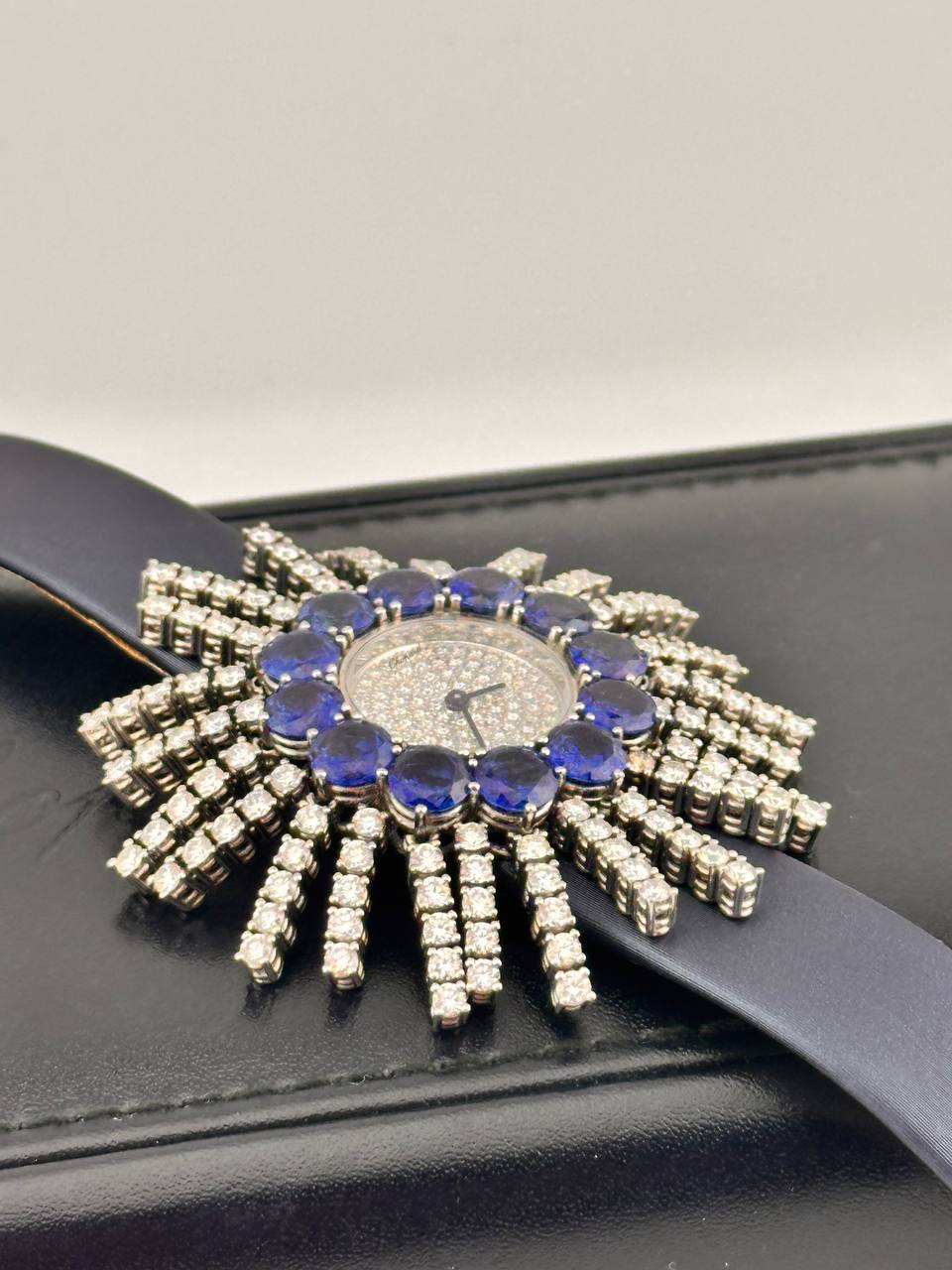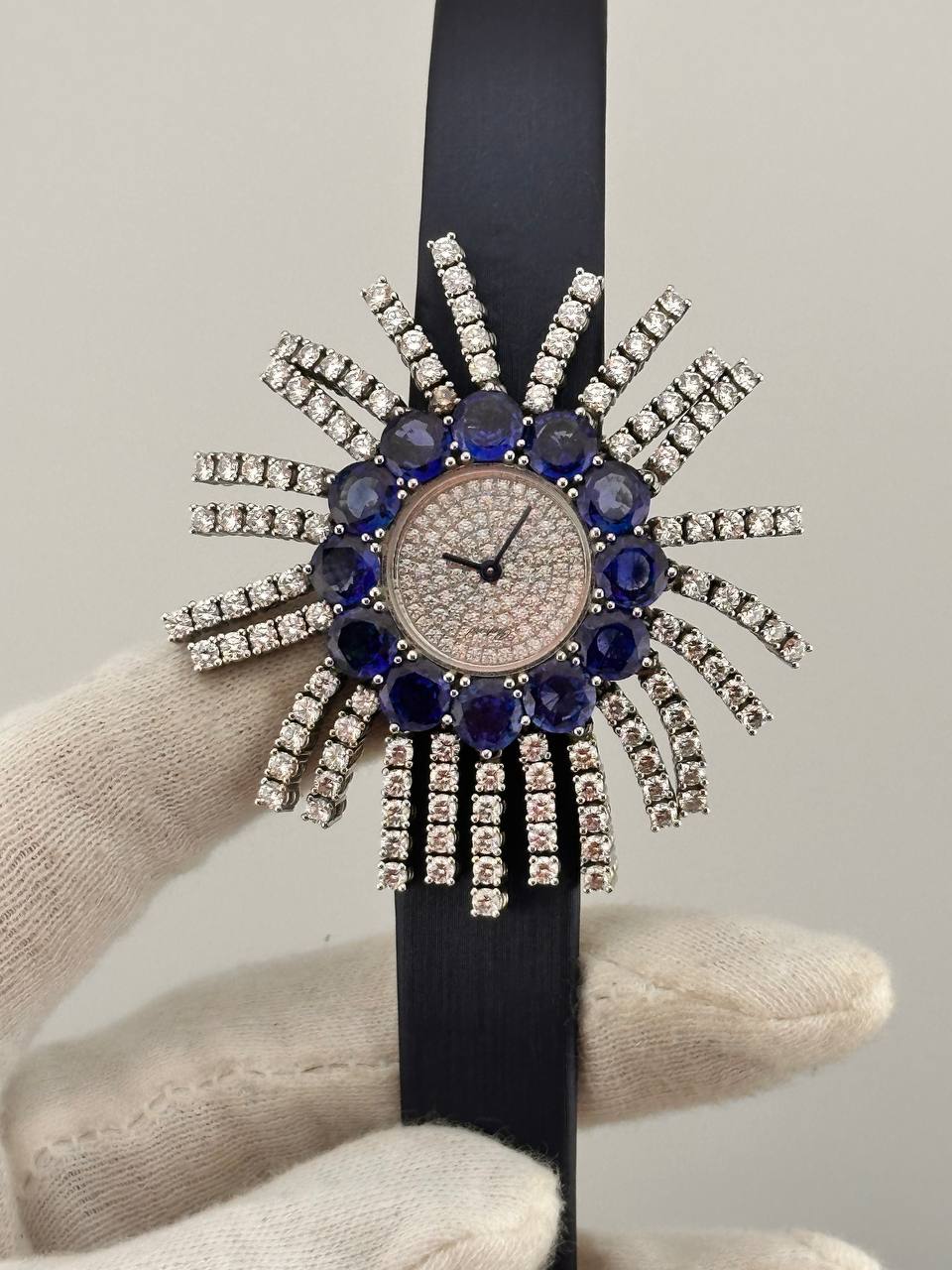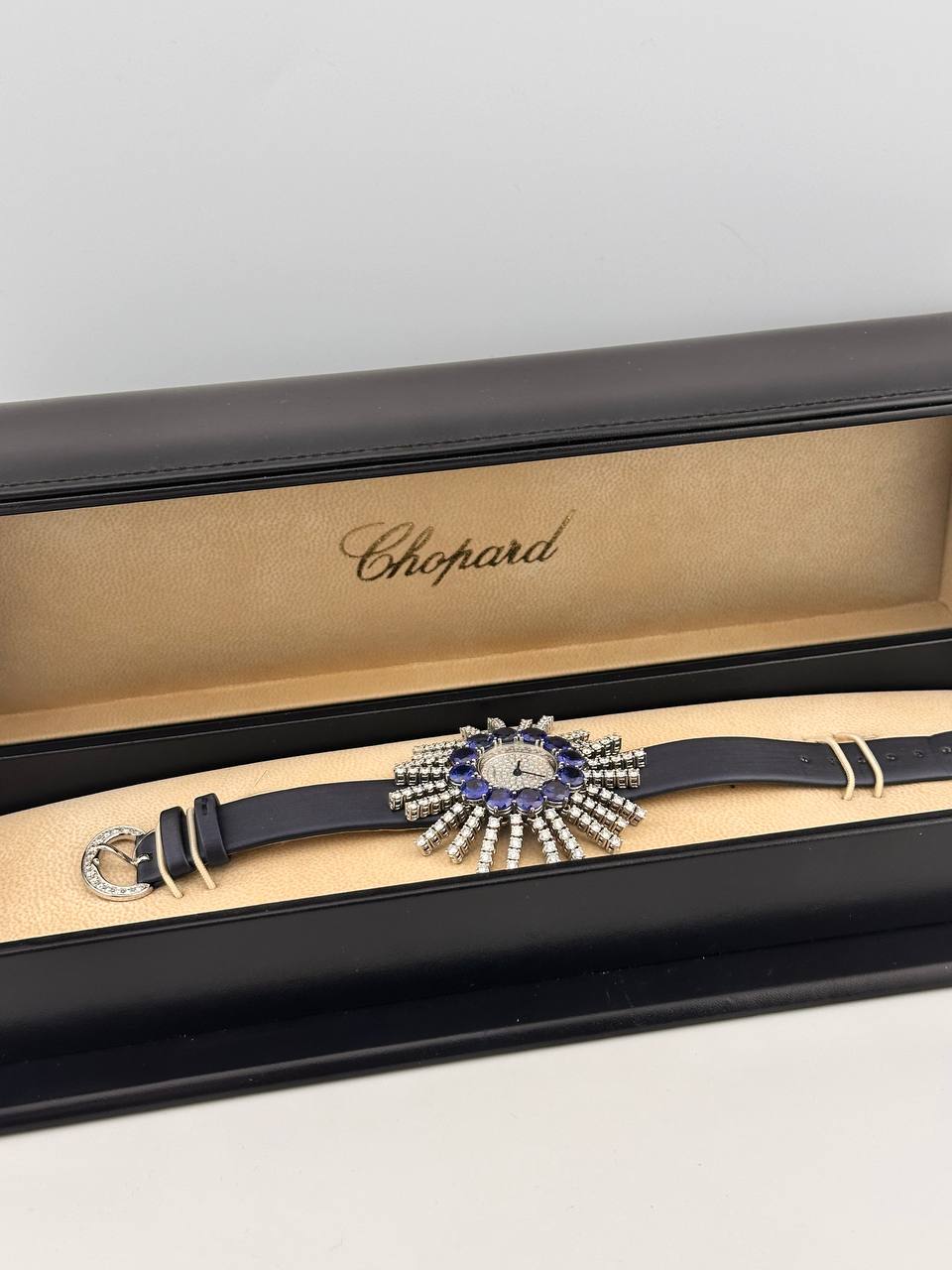 Элегантные швейцарские часы Chopard в корпусе из белого золота. Кварцевый механизм обеспечивает точность, а размер 53 х 26 мм и сатиновый ремешок подчеркивают их изысканность.