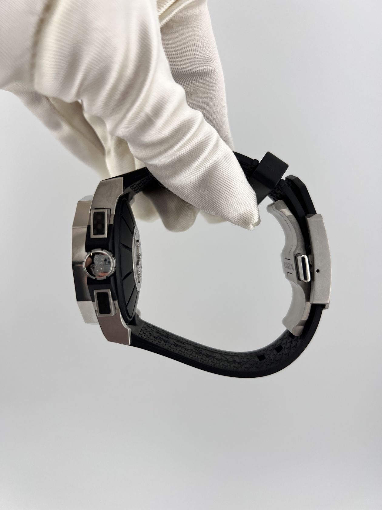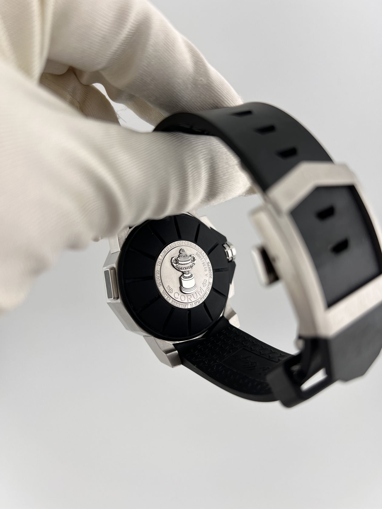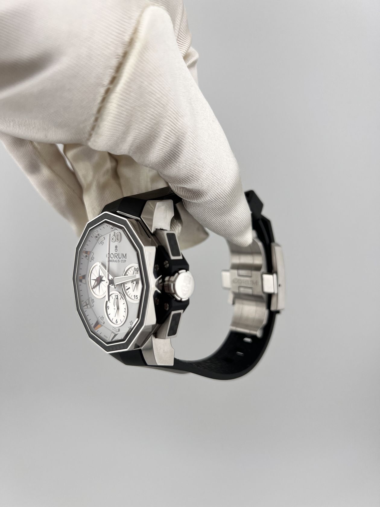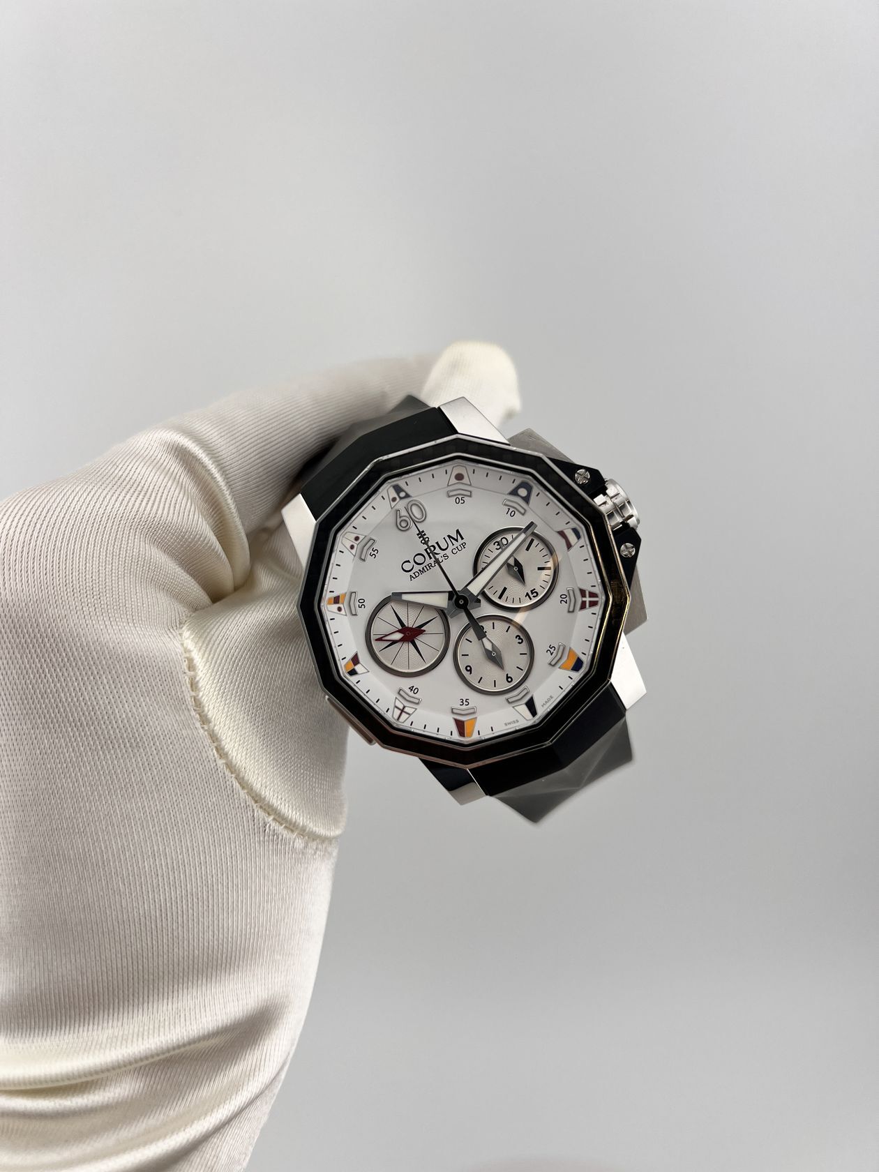 Культовый хронограф Corum Admiral’s Cup в 44-миллиметровом стальном корпусе. Оснащен надежным автоматическим механизмом со сплит-хронографом и дополнен спортивным каучуковым ремешком. Модель с фирменным двенадцатигранным безелем сочетает морское наследие и элегантный стиль.