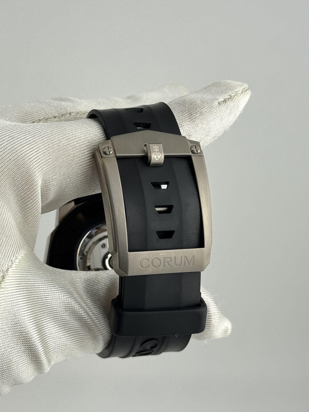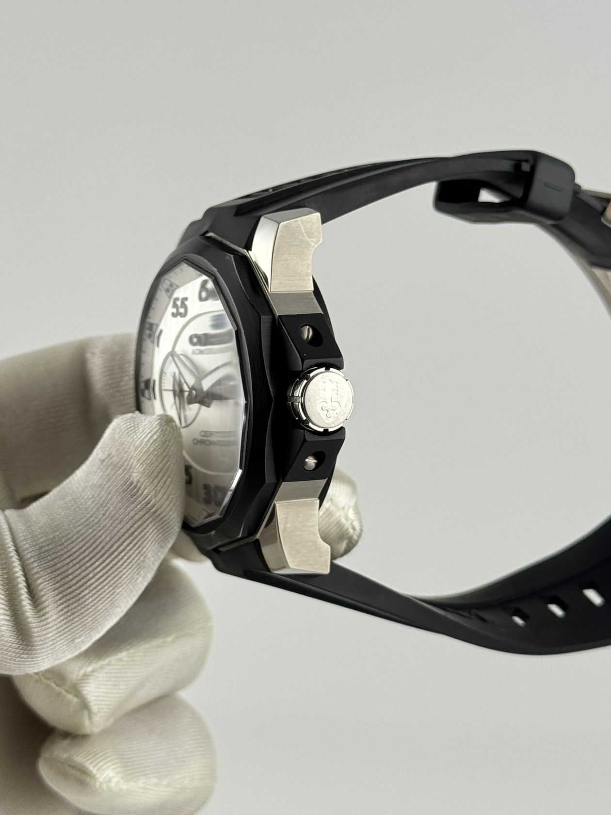 Культовые часы Corum Admirals Cup (Ref. 01.0068) с узнаваемым двенадцатигранным корпусом. Модель в стальном корпусе диаметром 46 мм оснащена надежным автоматическим механизмом и дополнена спортивным каучуковым ремешком.