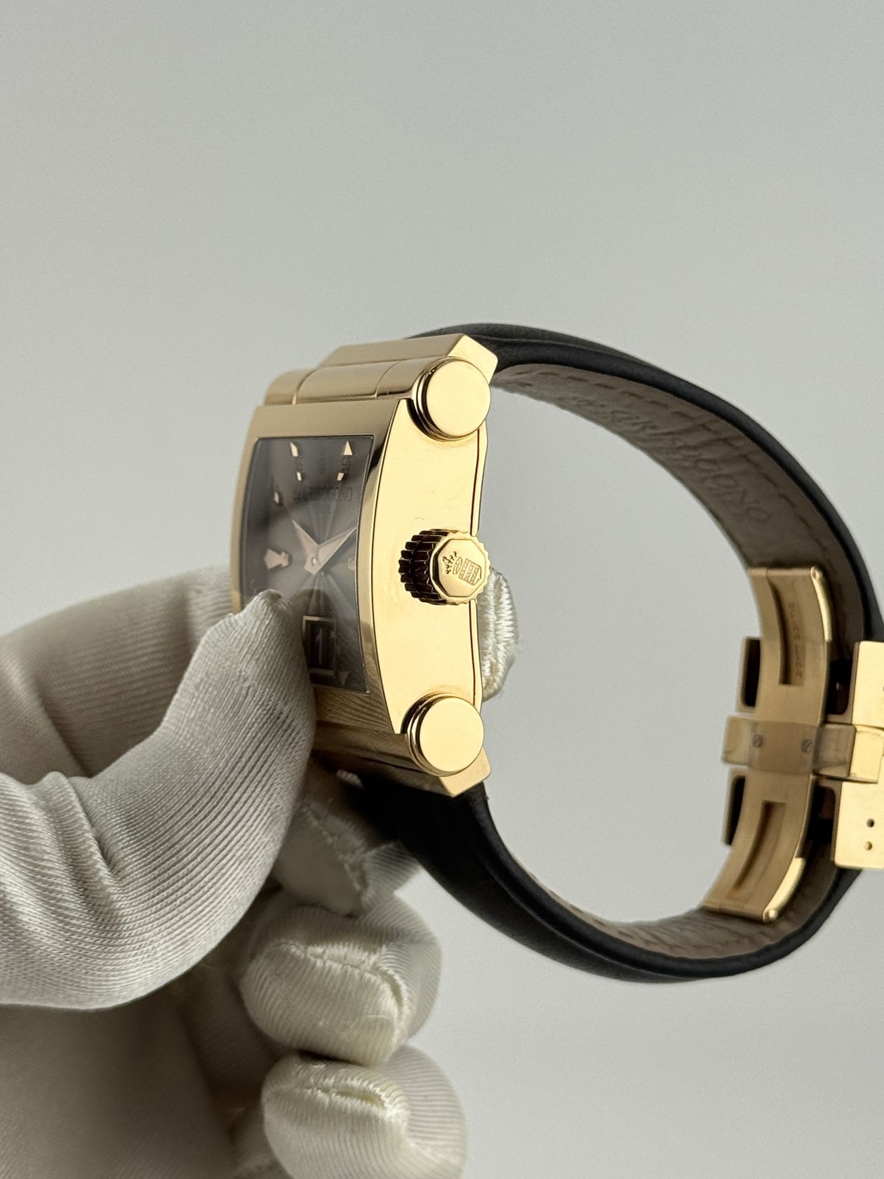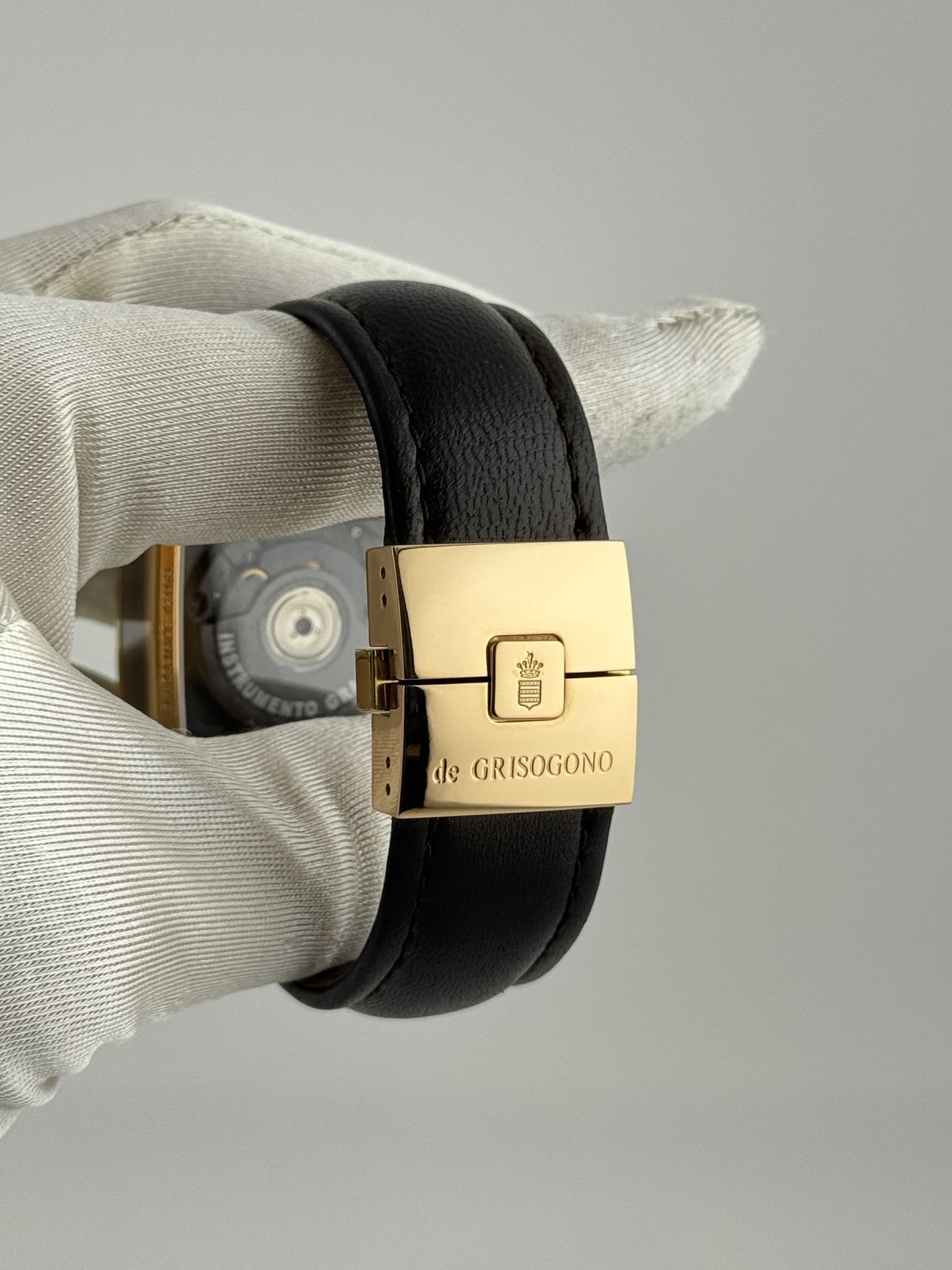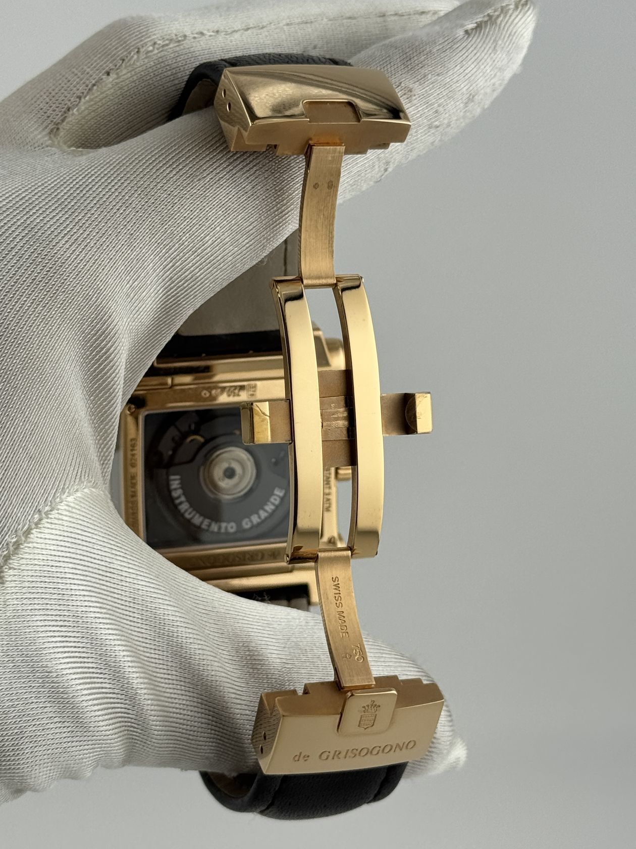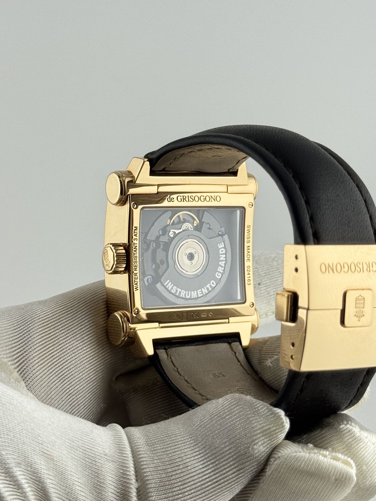 Элегантные швейцарские часы De Grisogono Instrumento Grande. Корпус из золота 750 пробы (47 х 40 мм) оснащен автоматическим механизмом. Изысканный кожаный ремешок подчеркивает роскошный стиль этой модели.