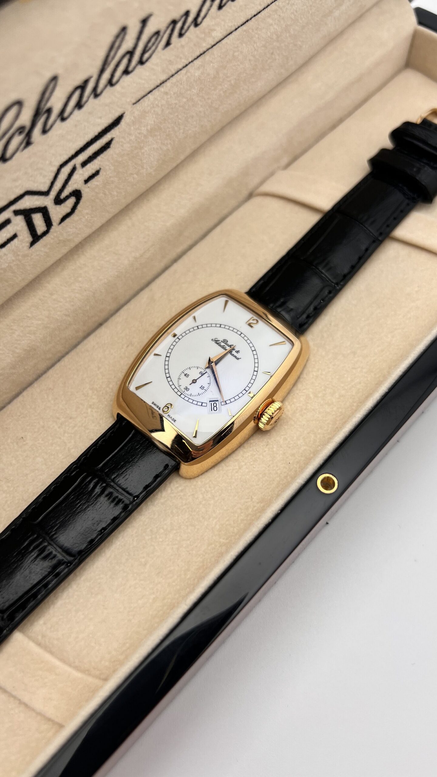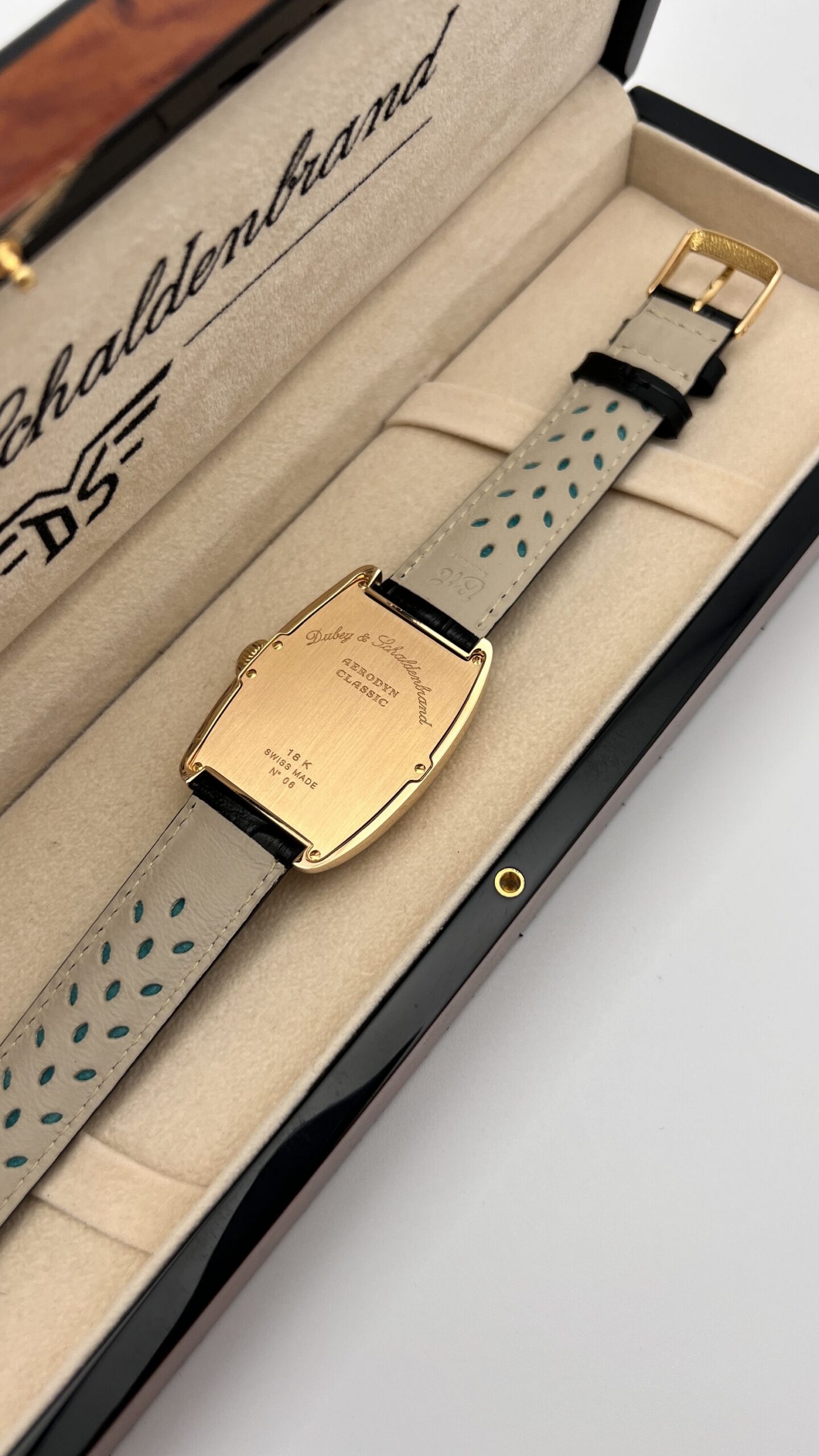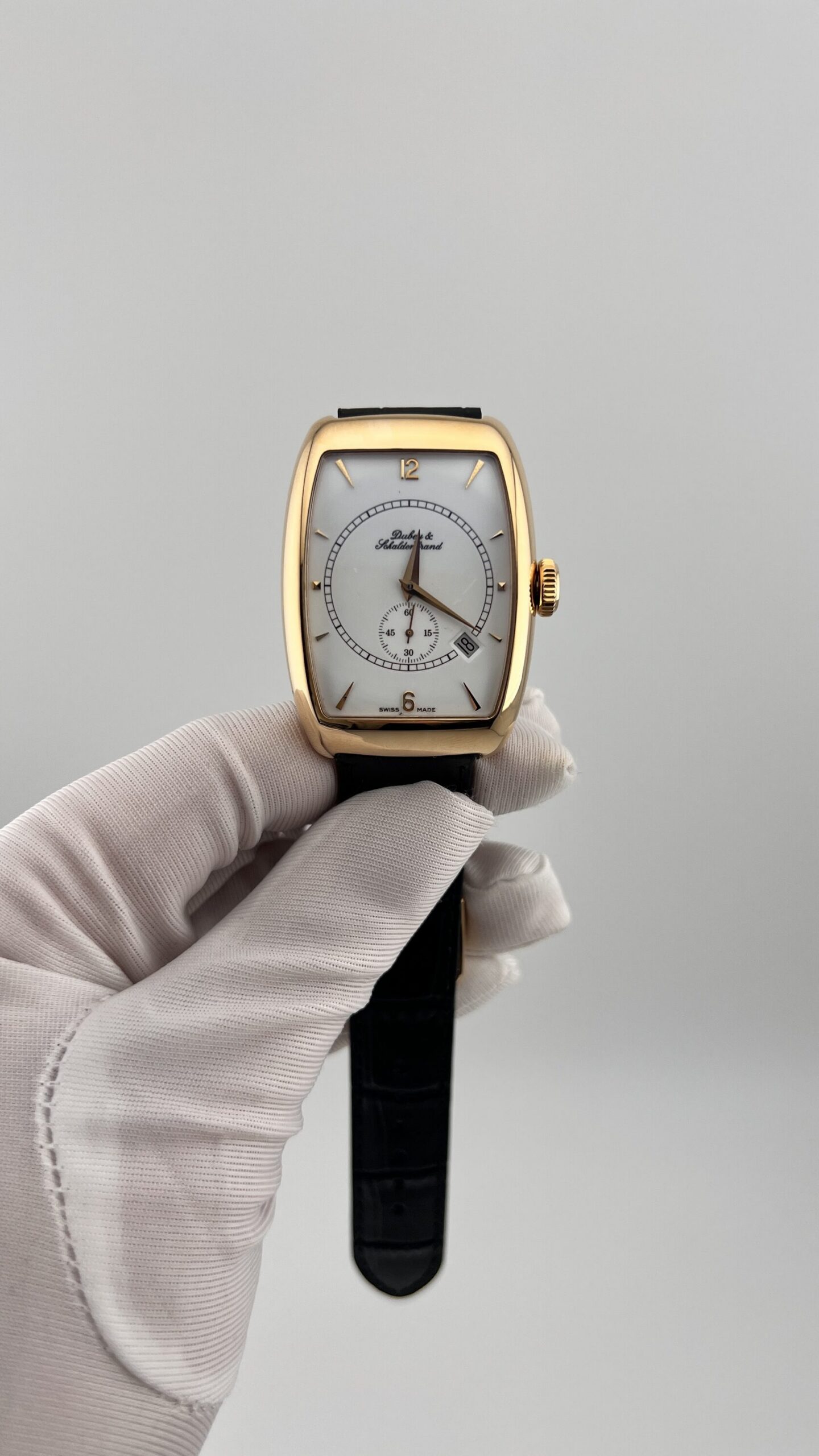 Наручные часы Dubey & Shaldenbrand, модель 6.0. Элегантный прямоугольный корпус 33 х 44 мм из золота. Оснащены надежным швейцарским механизмом с автоподзаводом. Ремешок из натуральной кожи.