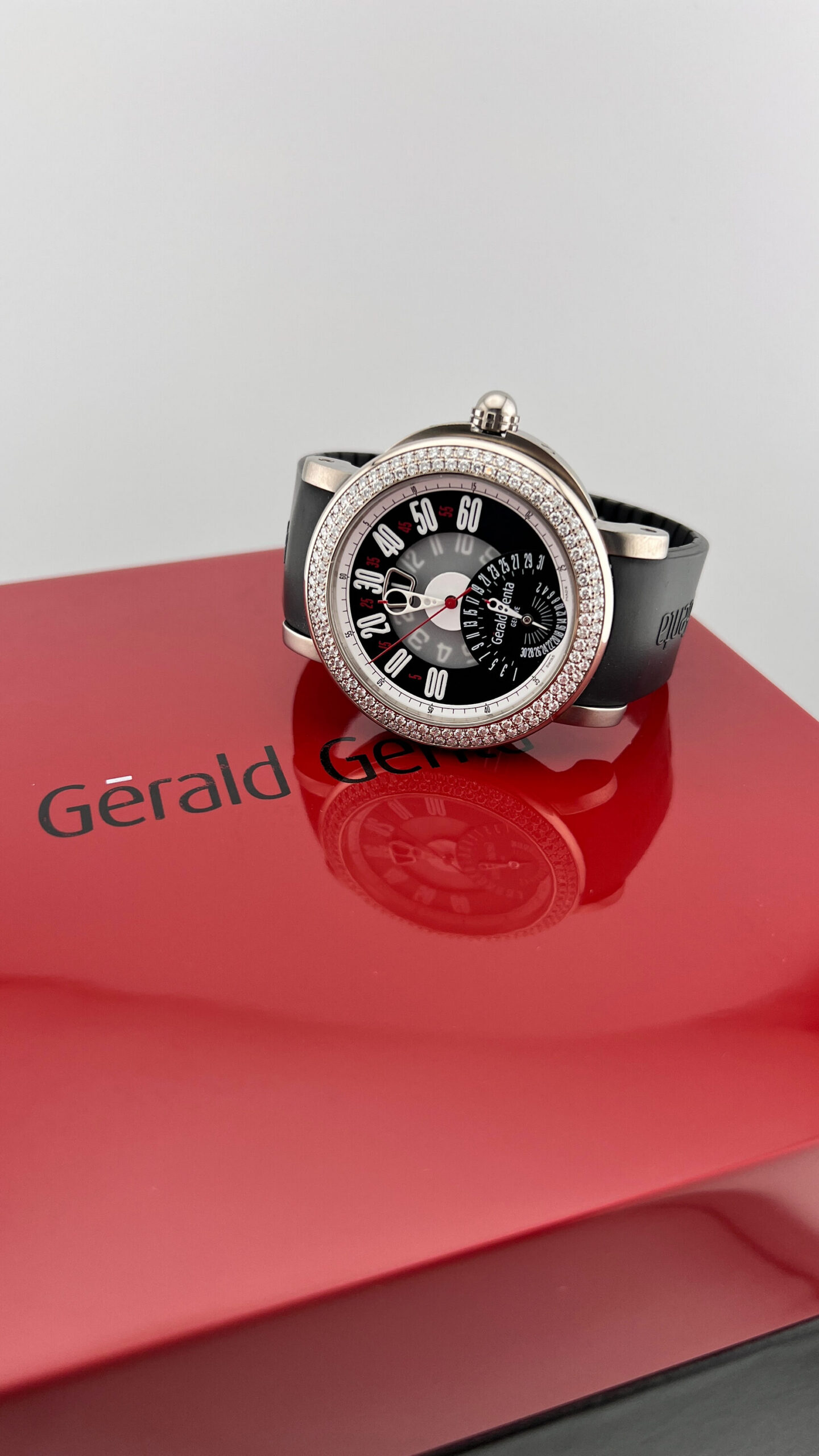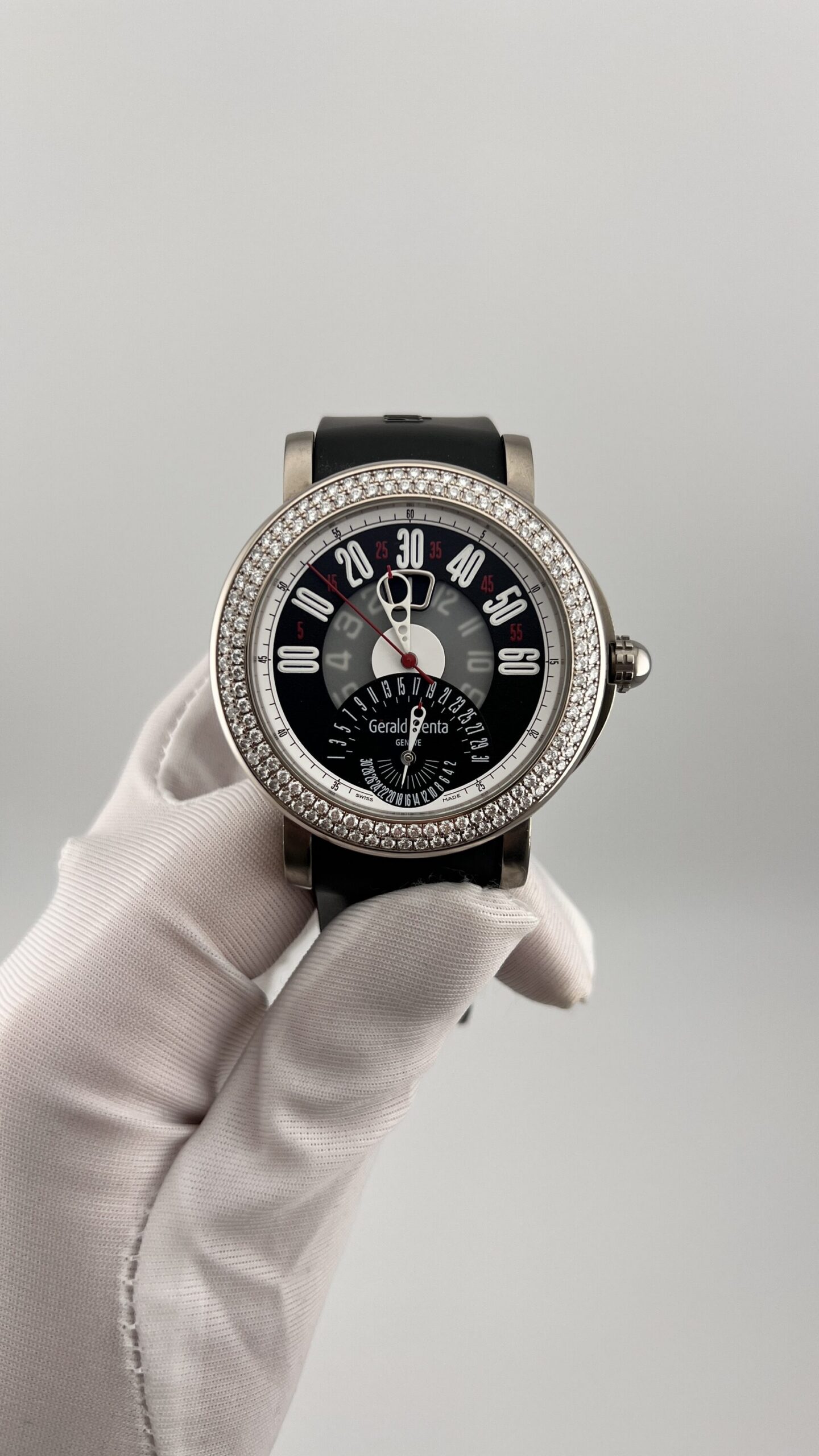 Эффектные часы Gerald Genta VSP.Y.86 в корпусе из золота с бриллиантами. Модель диаметром 45 мм оснащена механизмом с автоподзаводом и дополнена стильным каучуковым ремешком.