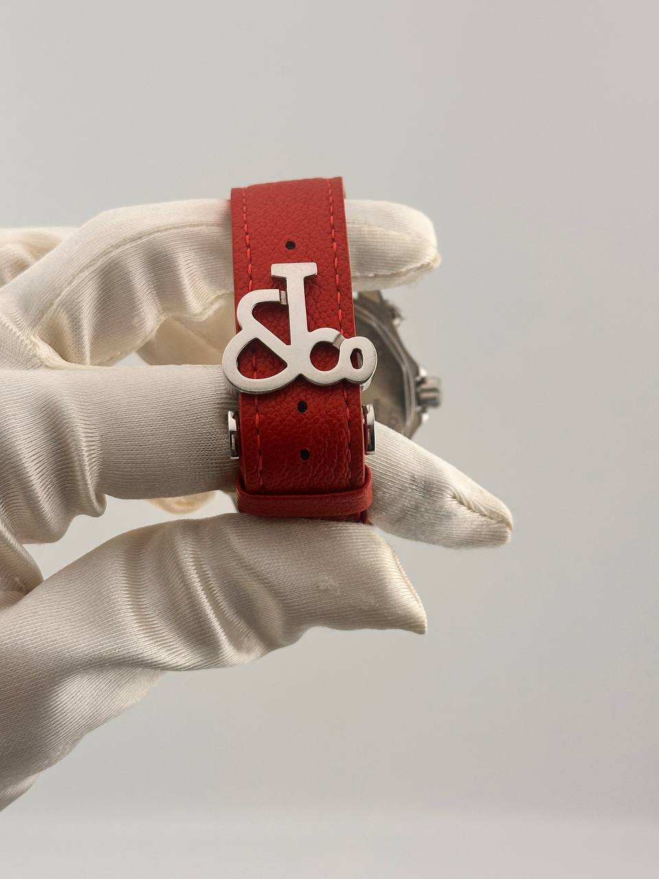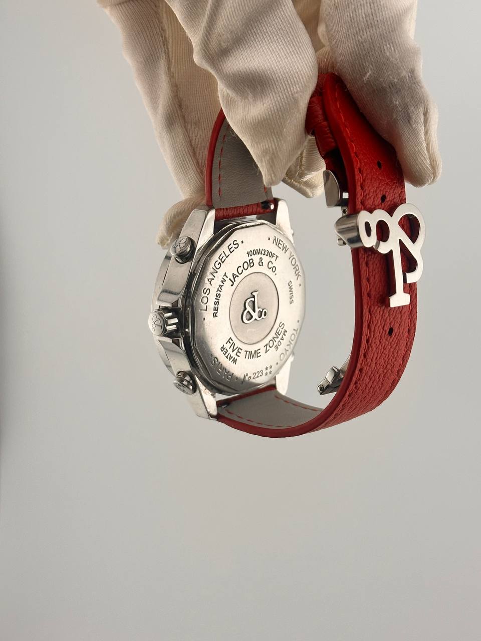 Стильные часы Jacob&Co в корпусе из стали, диаметром 41 мм. Оснащены надежным автоматическим механизмом (автоподзавод) и дополнены элегантным кожаным ремешком.