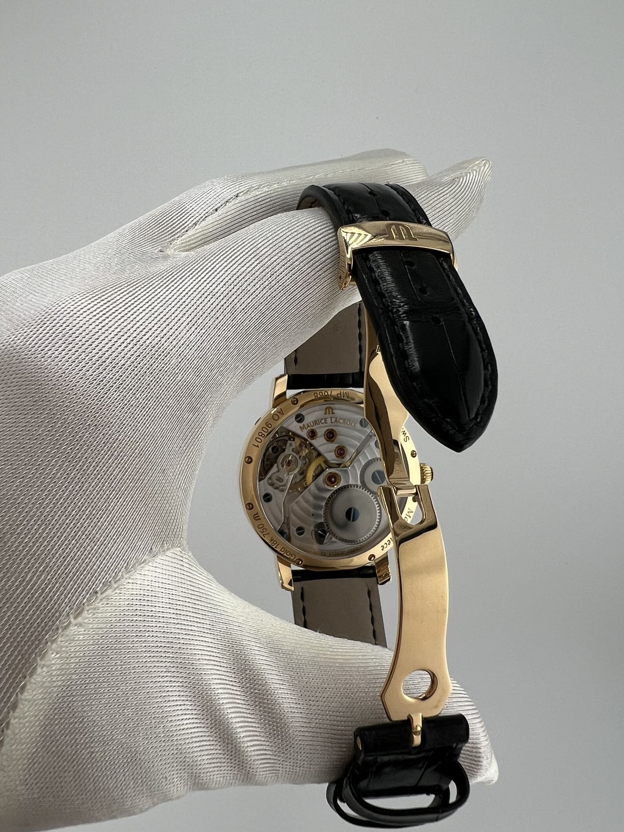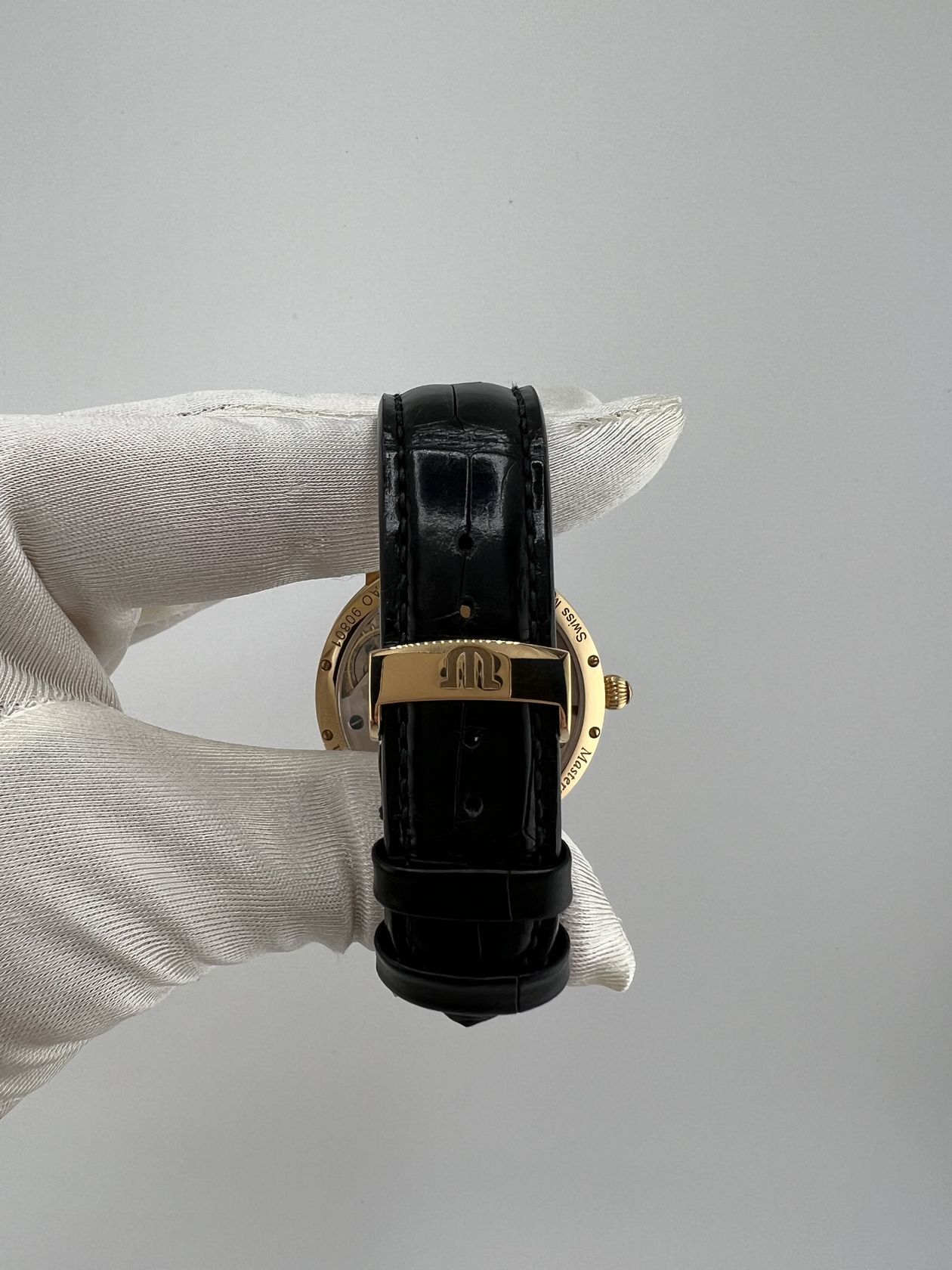 Швейцарские часы Maurice Lacroix Calendrier Retrograde Masterpiece в элегантном корпусе из золота (43 мм). Оснащены механизмом с ручным заводом и дополнены классическим кожаным ремешком.