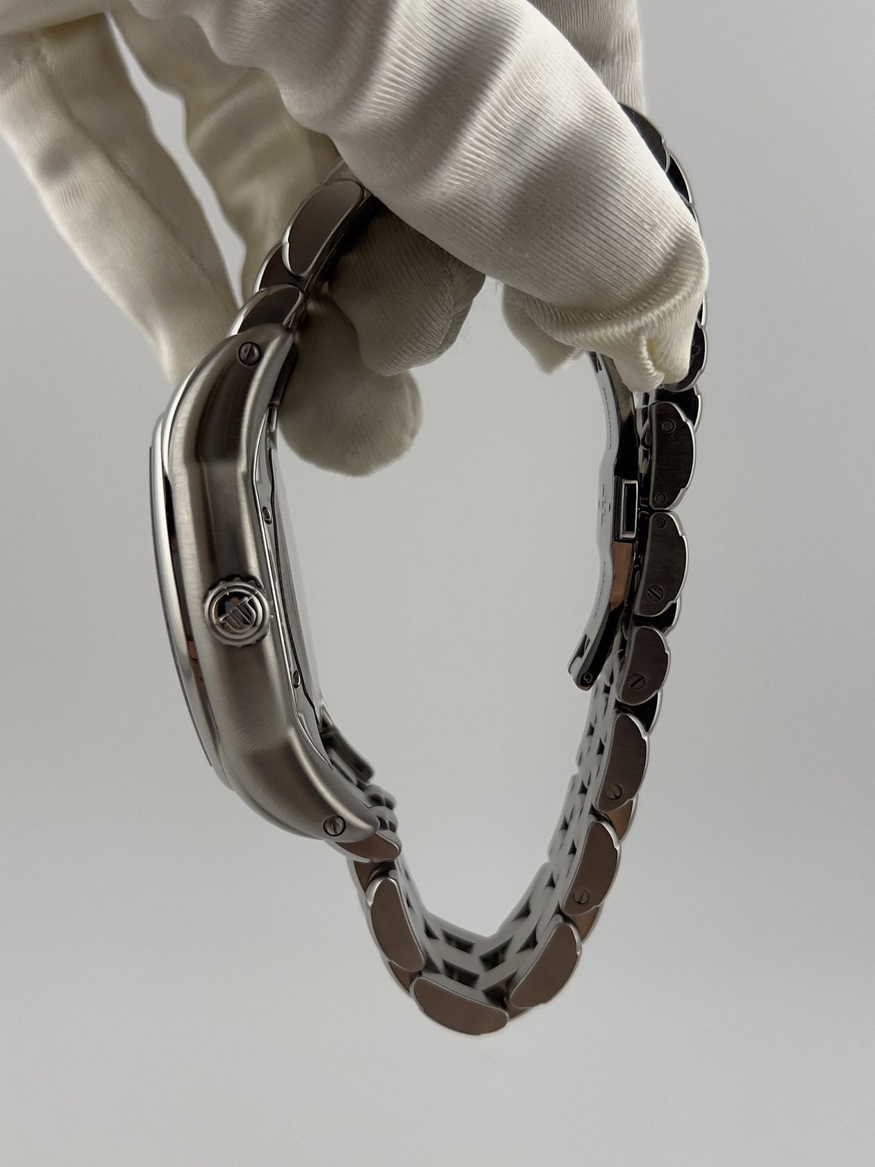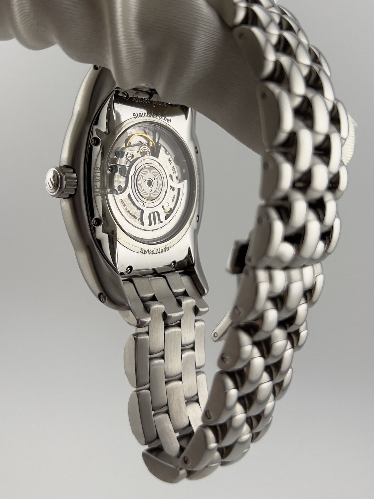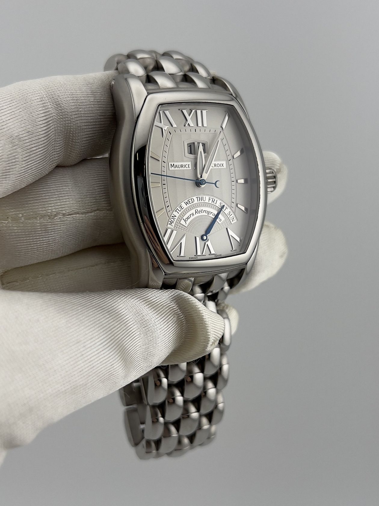 Швейцарские часы Maurice Lacroix Masterpiece MP6119 – воплощение часового искусства в корпусе-тонно из нержавеющей стали (39 х 51.6 мм). Модель оснащена надежным автоматическим механизмом с функцией ретроградного указателя дня недели и большим двойным окном даты. Элегантный дизайн дополнен стальным браслетом.