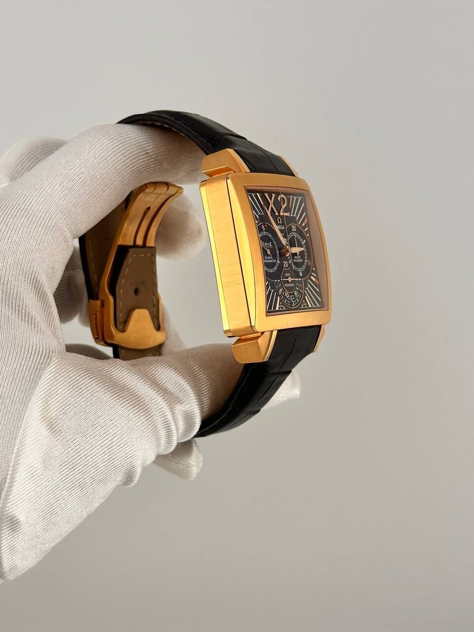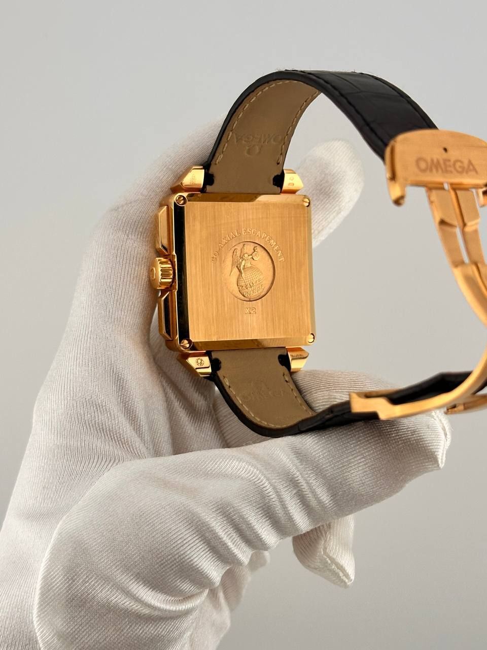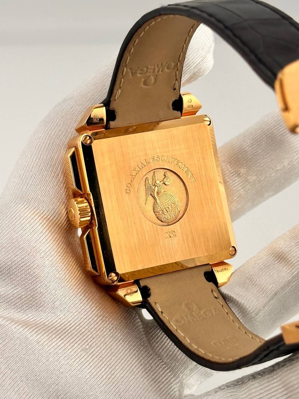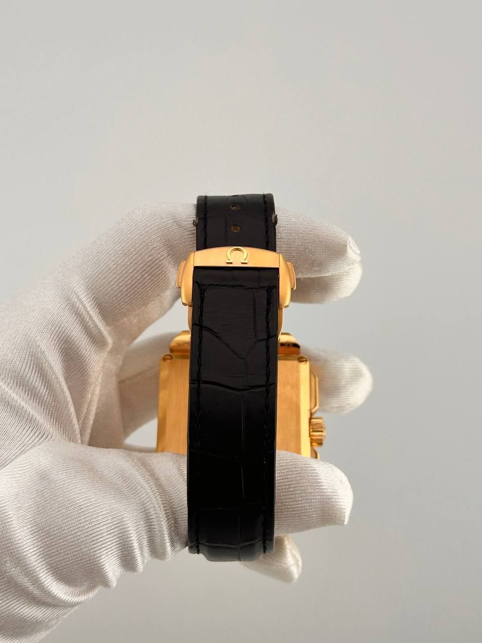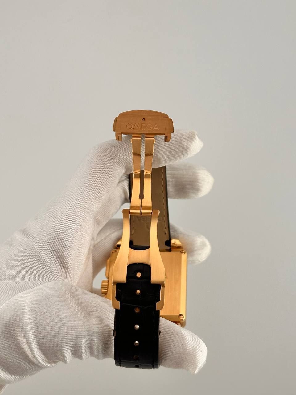 Изысканный хронограф Omega De Ville X2 Co-Axial (Ref. 423.53.37.50.01.001) в корпусе из красного золота 37 x 37 мм. Часы оснащены автоматическим механизмом Omega 3202 с коаксиальным спуском (хронометр COSC) и коричневым циферблатом. Дополнены элегантным ремешком из кожи аллигатора.
