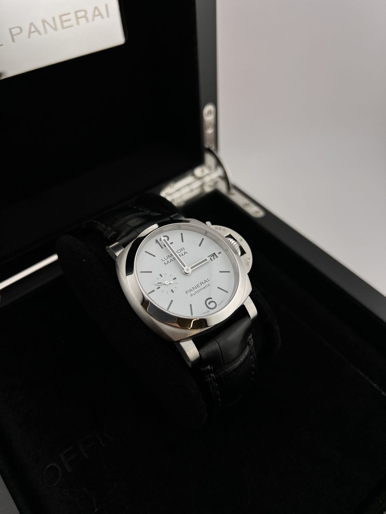 Культовые Panerai Luminor Marina Quaranta PAM01271: классика в компактном корпусе 40 мм из нержавеющей стали. Узнаваемый дизайн Luminor с подушкообразным корпусом, защитным мостом и матовым белым циферблатом дополнен элегантным ремешком из кожи аллигатора. Внутри установлен надежный автоматический калибр P.900 с 3-дневным запасом хода и водонепроницаемостью 100 м, что делает их идеальным выбором для повседневной носки.