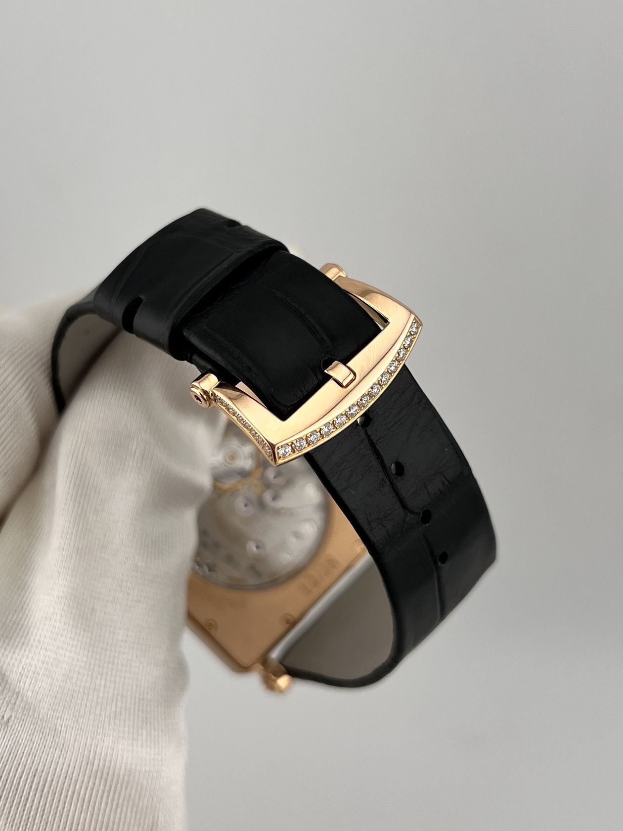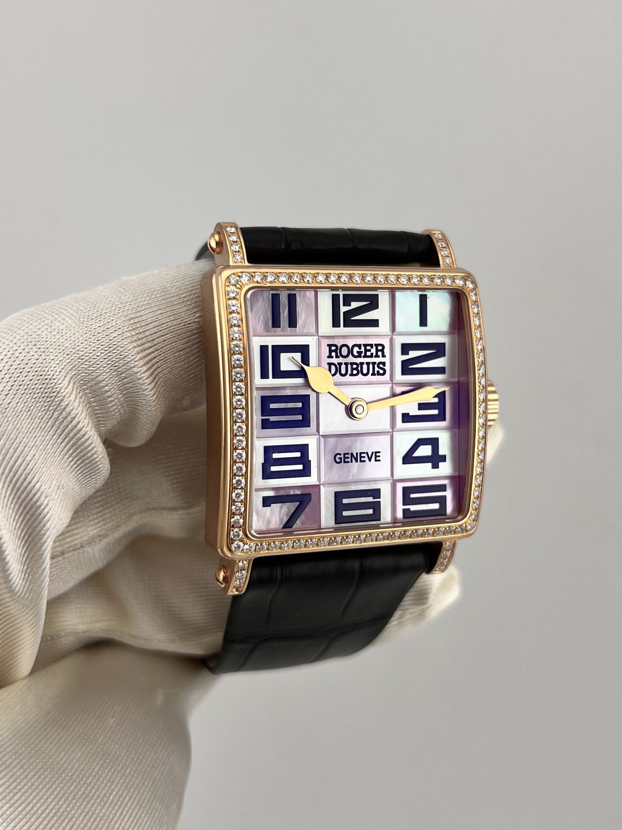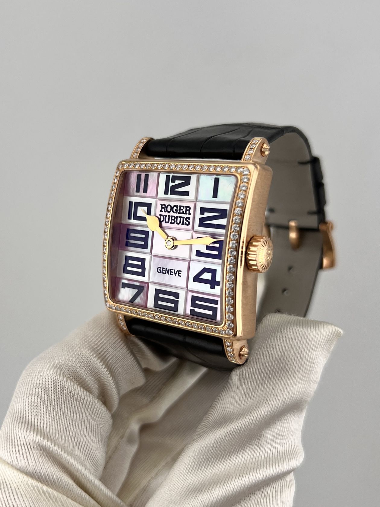 Roger Dubuis Golden-Square — элегантные часы в корпусе из розового золота (33×33 мм). Модель оснащена надежным механическим калибром с ручным заводом и дополнена классическим кожаным ремешком. REF: G 34.98.5-SDC.