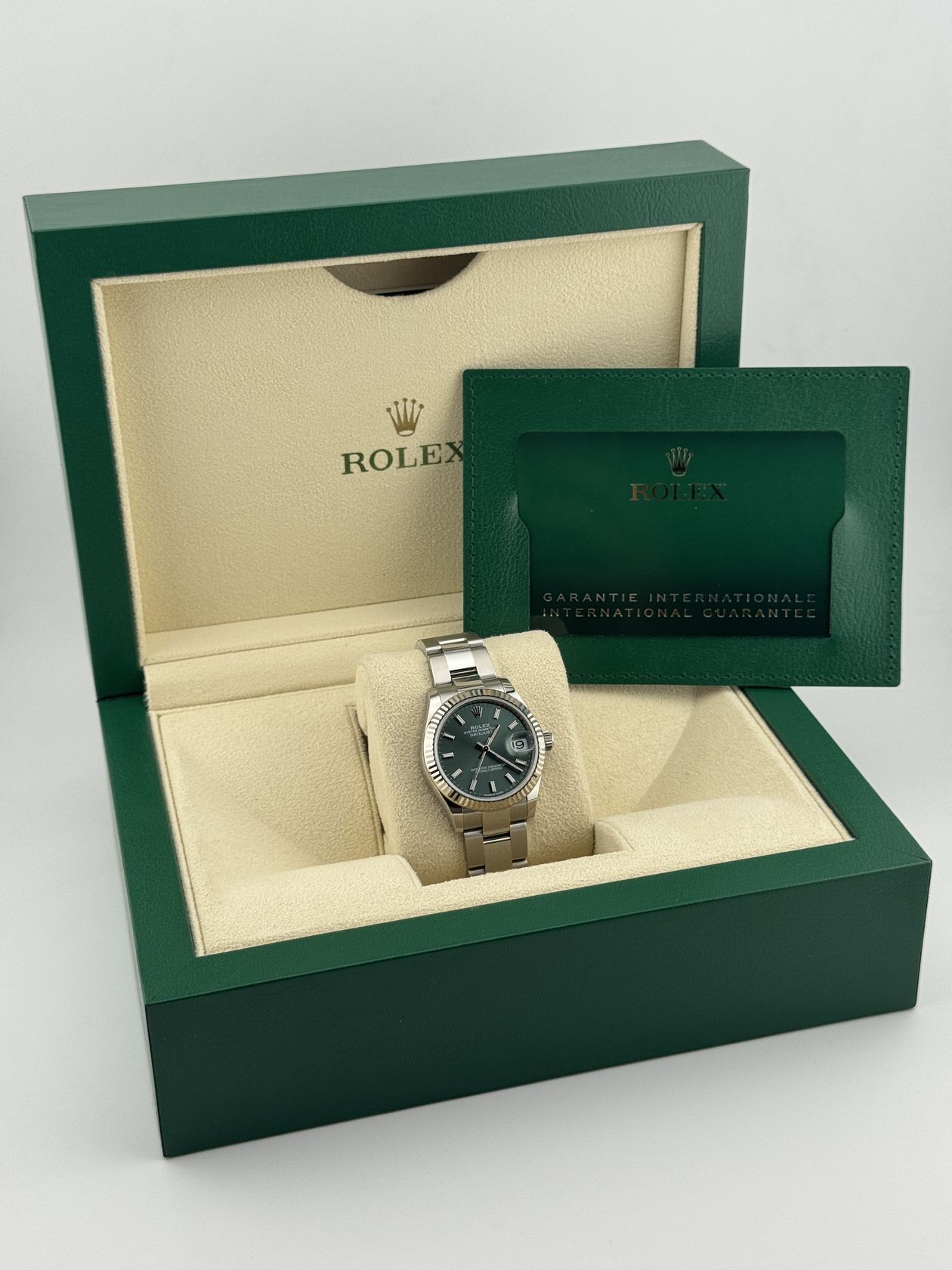 Изысканные женские часы Rolex DateJust 31 (Ref. 278274) в корпусе 31 мм из белого Rolesor (сталь и белое золото). Модель с рифленым безелем и браслетом Jubilee оснащена автоматическим механизмом с сертификацией Сверхточный хронометр.