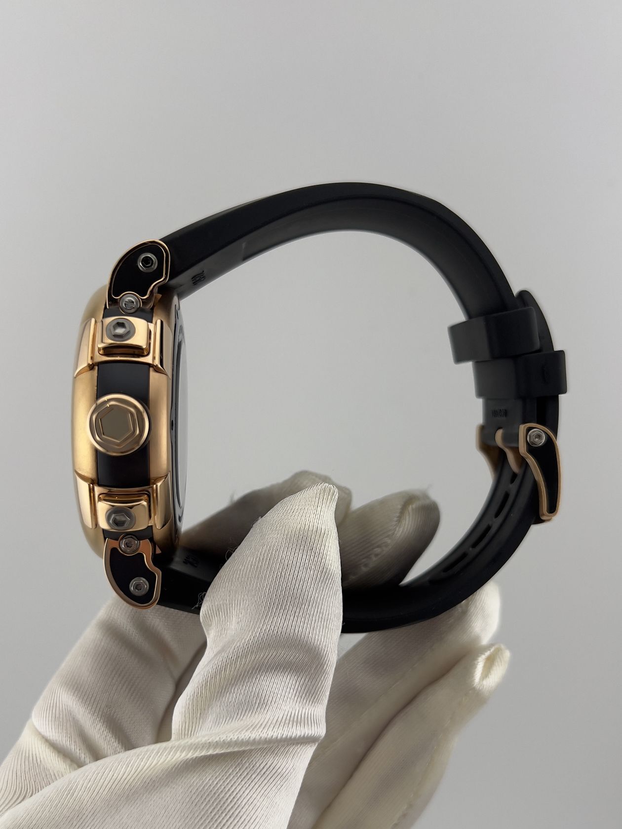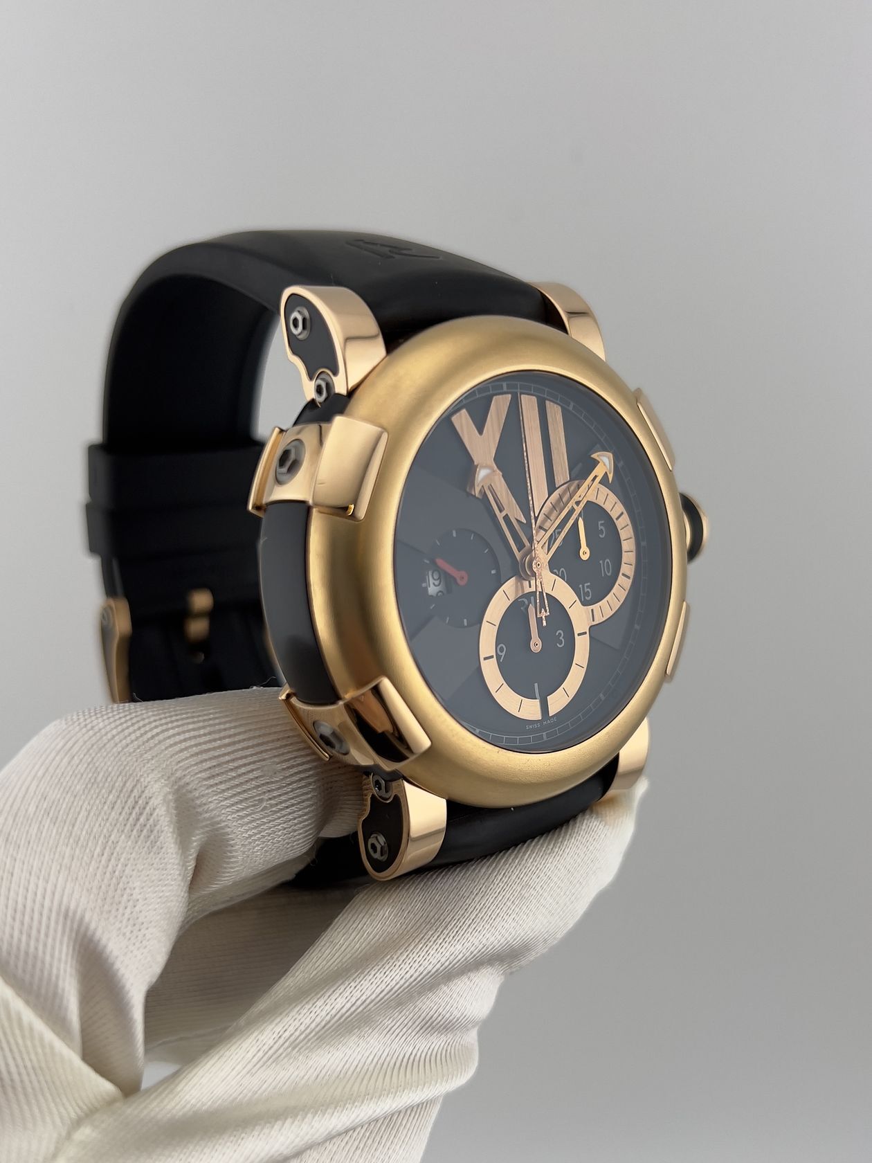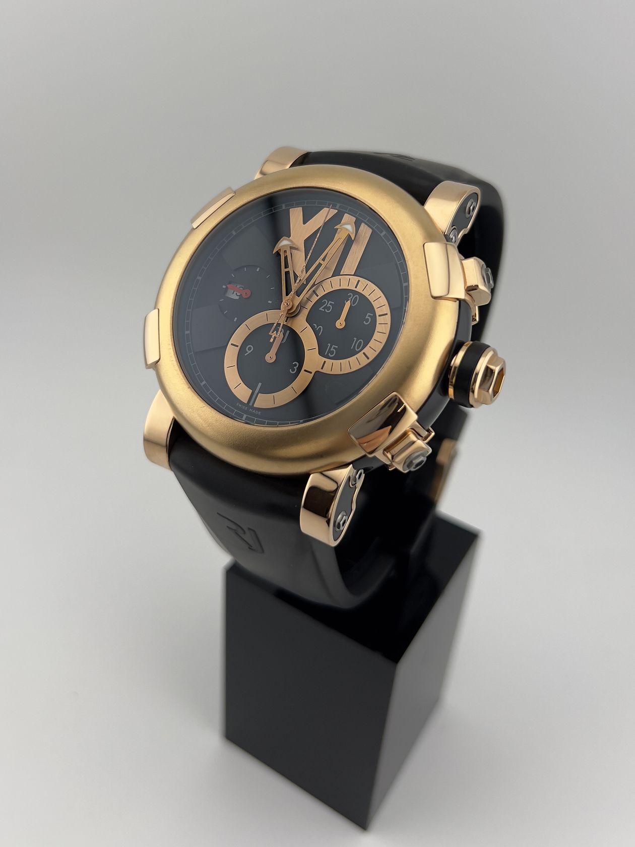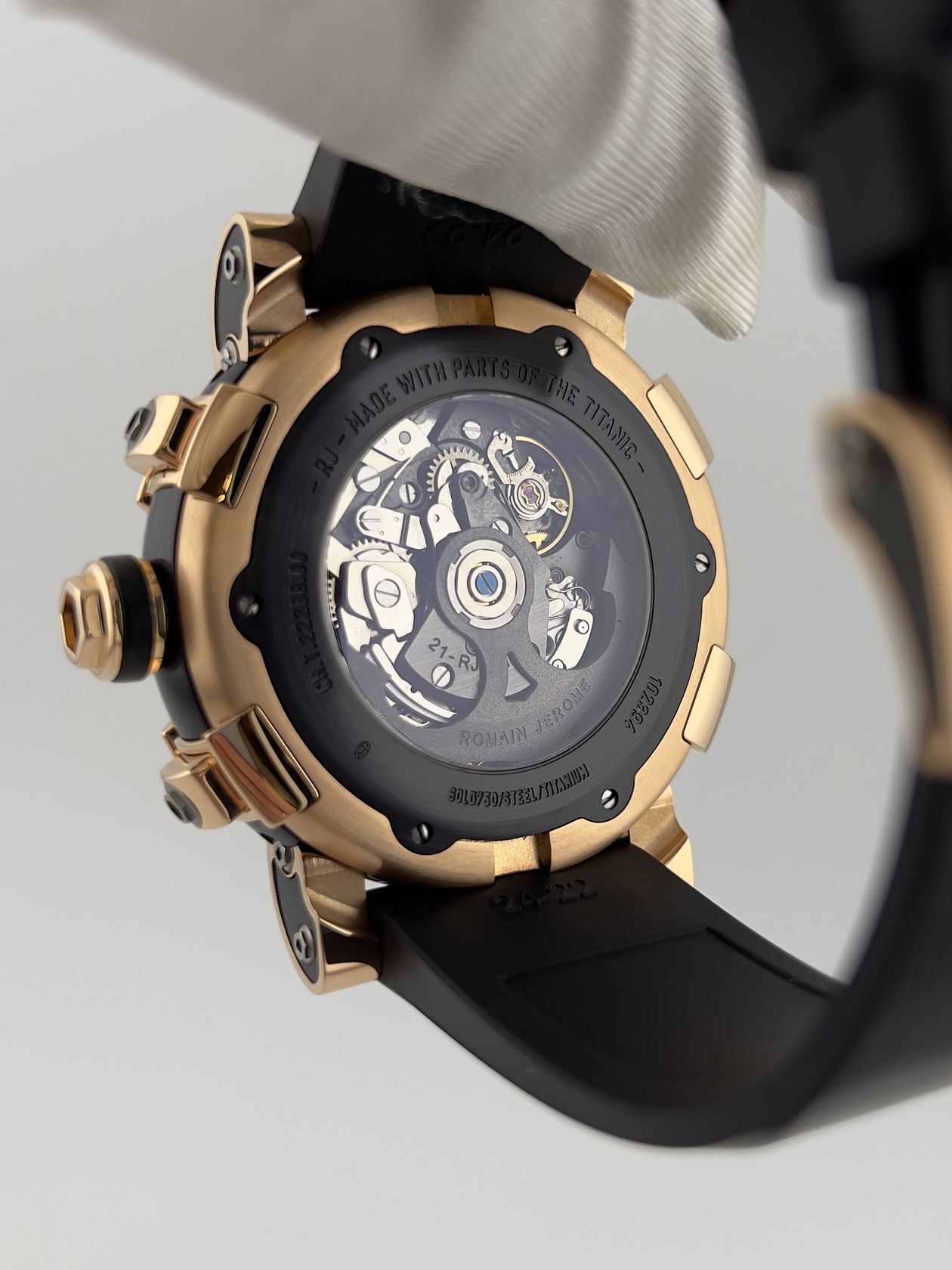 Мужской хронограф Romain Jerome Titanic-DNA (Ref. CH.T.222BB.00) в массивном корпусе 50 мм из золота и стали. Часы оснащены автоматическим механизмом и являются частью уникальной коллекции, созданной с использованием аутентичных материалов легендарного лайнера «Титаник». Комплектуется черным каучуковым ремешком.