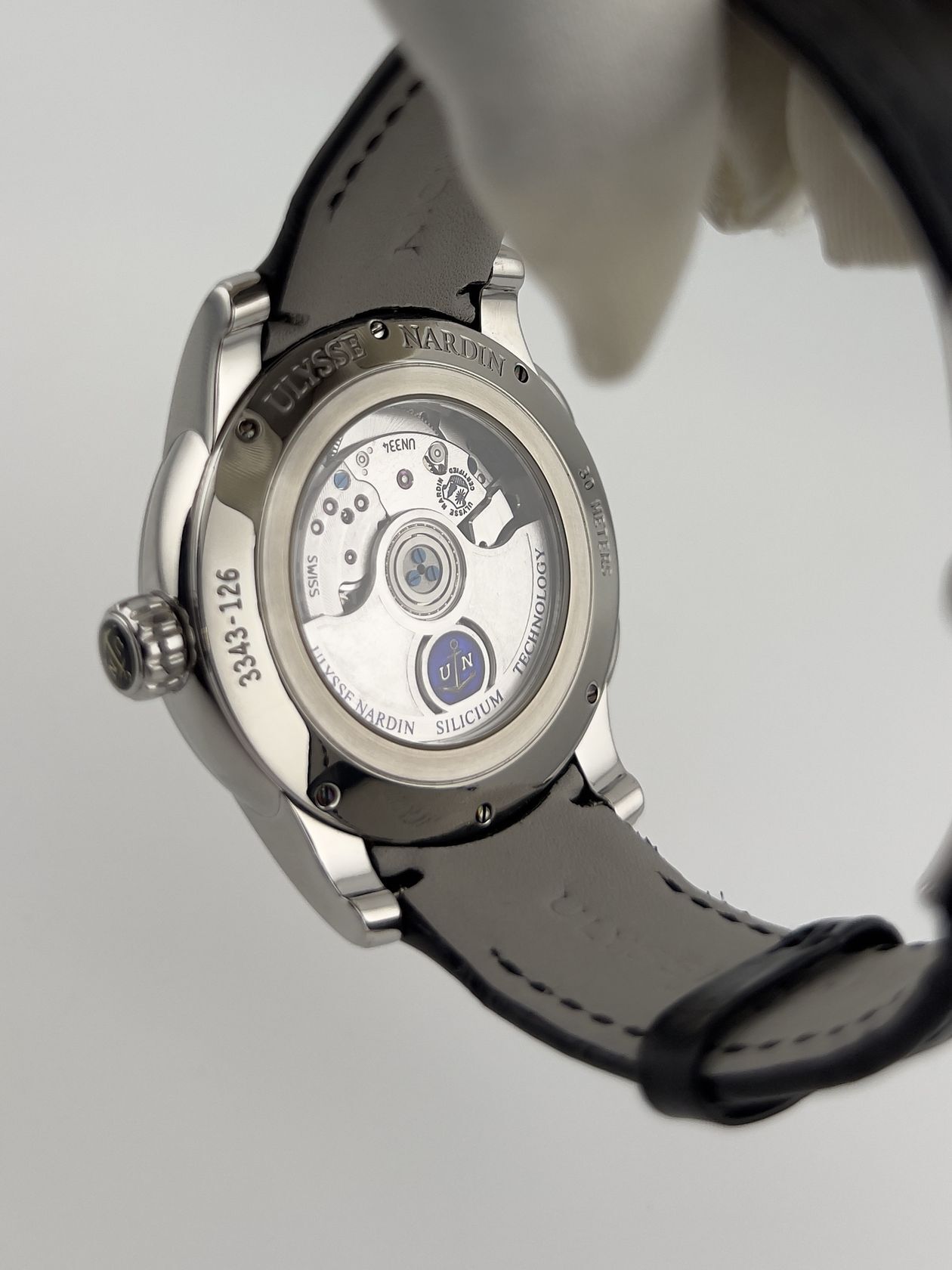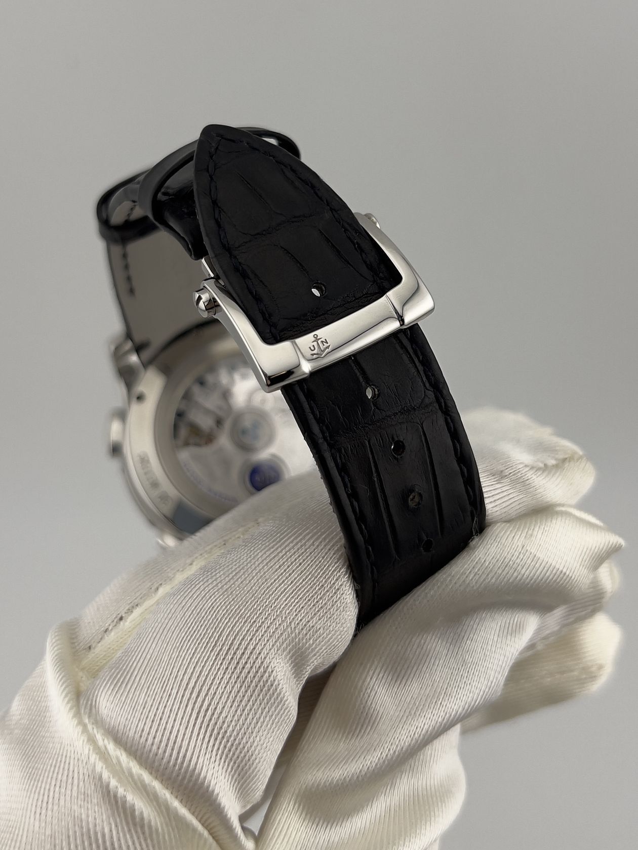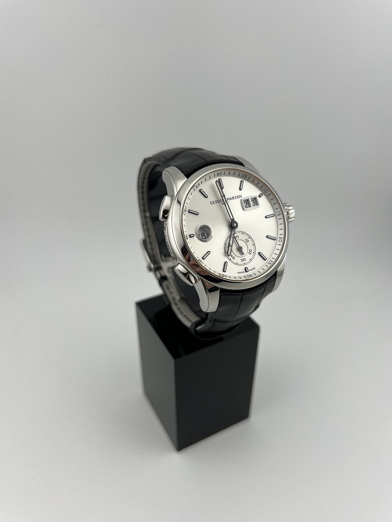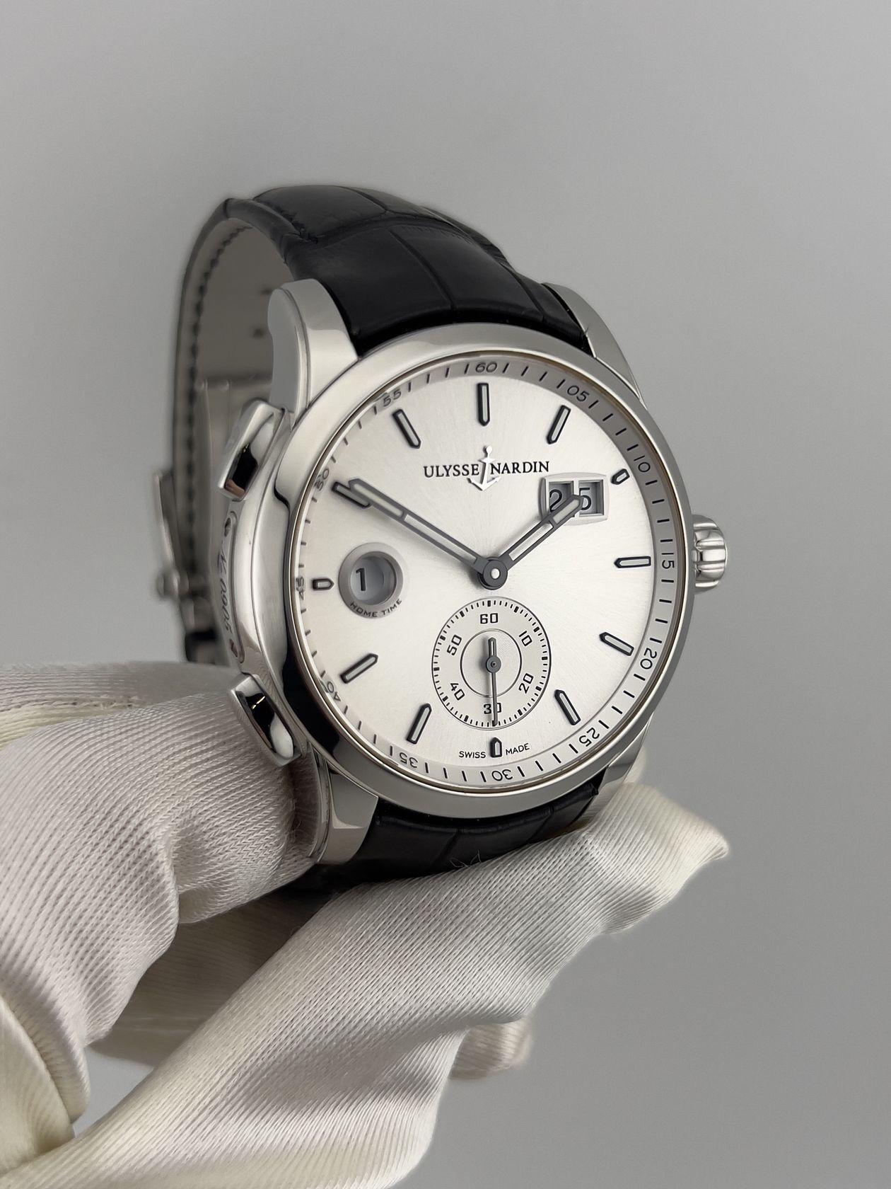 Часы Ulysse Nardin Dual Time. Элегантная стальная модель диаметром 42 мм с надежным автоматическим механизмом, дополненная ремешком из натуральной кожи аллигатора.