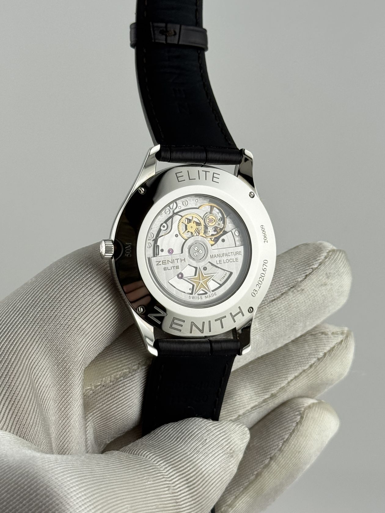 Элегантные швейцарские часы Zenith Elite (Ref: 03.2020.670) в стальном корпусе диаметром 40 мм. Оснащены надежным механизмом с автоподзаводом и дополнены классическим кожаным ремешком. Идеальный выбор для ценителей минимализма и высокого часового искусства.
