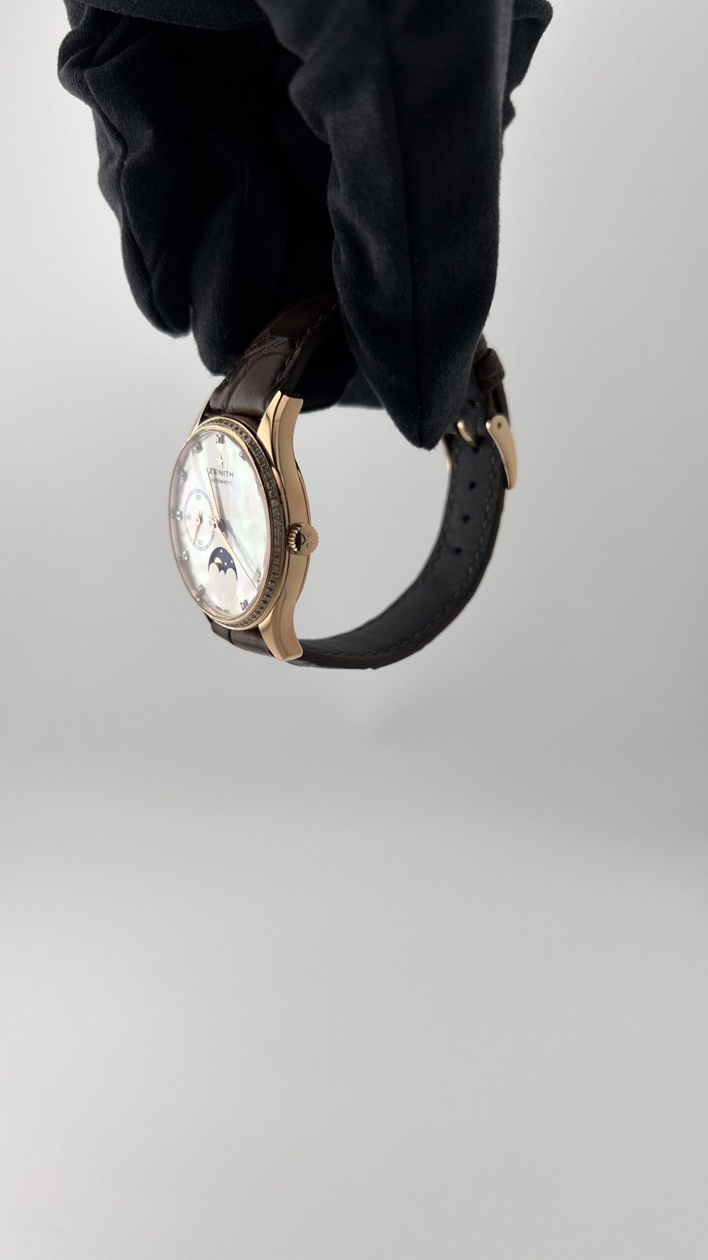 Zenith Elite — элегантные швейцарские часы с автоподзаводом. Корпус из золота диаметром 33 мм дополнен изысканным кожаным ремешком. REF: 222310692.
